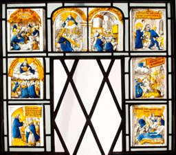Verre incolore, bleu, vert, rose, bleu clair et violet ; verre doublé rouge gravé au verso ; peint avec de la grisaille et du jaune d’argent.