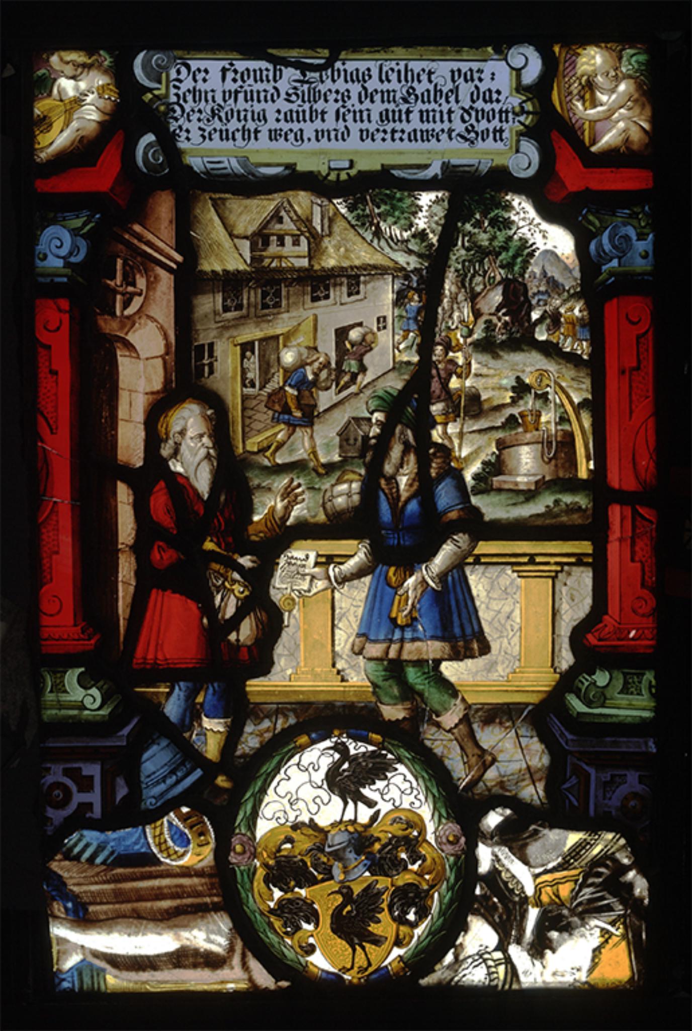 De grande qualité, ce vitrail, dont l’état de conservation est moyen, représente une scène vétérotestamentaire tirée du Livre de Tobie, à savoir Tobie envoyé par son père recouvrer une créance déposée chez Gabaël (Tb 4, 20 et Tb 9, 2). Il fait partie d’une série de vitraux historiés qui retracent l’histoire de Tobie et qui furent commandés par la corporation strasbourgeoise „Zum Schöffel“, dont 10 sont conservés au Victoria & Albert Museum (VAM, inv. C.560 à 569-1921 – cf. Rackham 1936, p. 94).