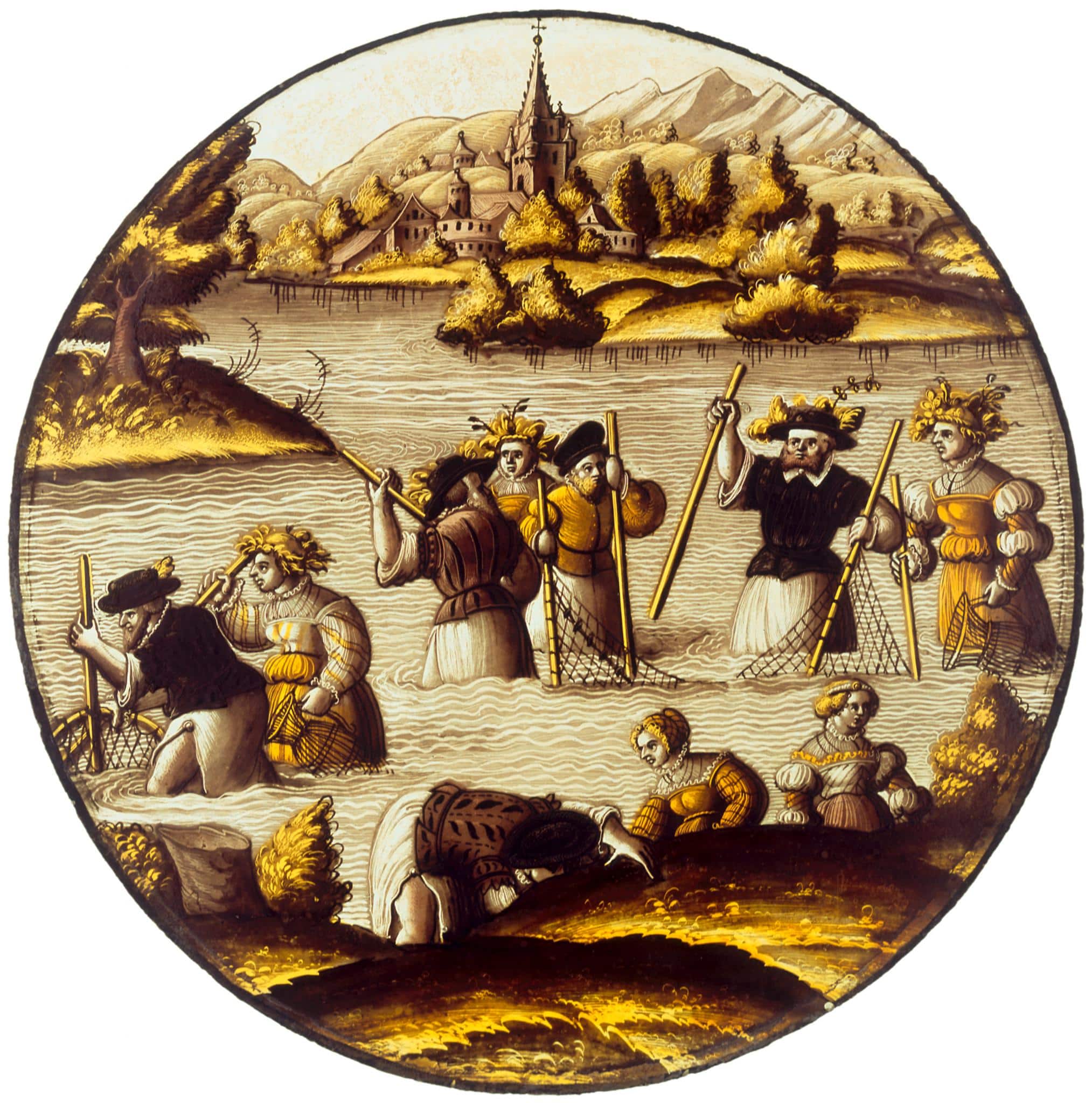 Le rondel représente, au centre d’un paysage composé, au premier plan, d’un plan d’eau, au second plan, d’un bourg dominé par le clocher d’une église coiffée d’une croix et, à l’horizon, de moyennes montagnes, cinq hommes et cinq femmes, habillés en bourgeois, dont certains coiffés d’un couvre-chef décoré d’éléments végétaux, en train de s’adonner à la pêche à l’aide de bâtons, filets et paniers à poissons.