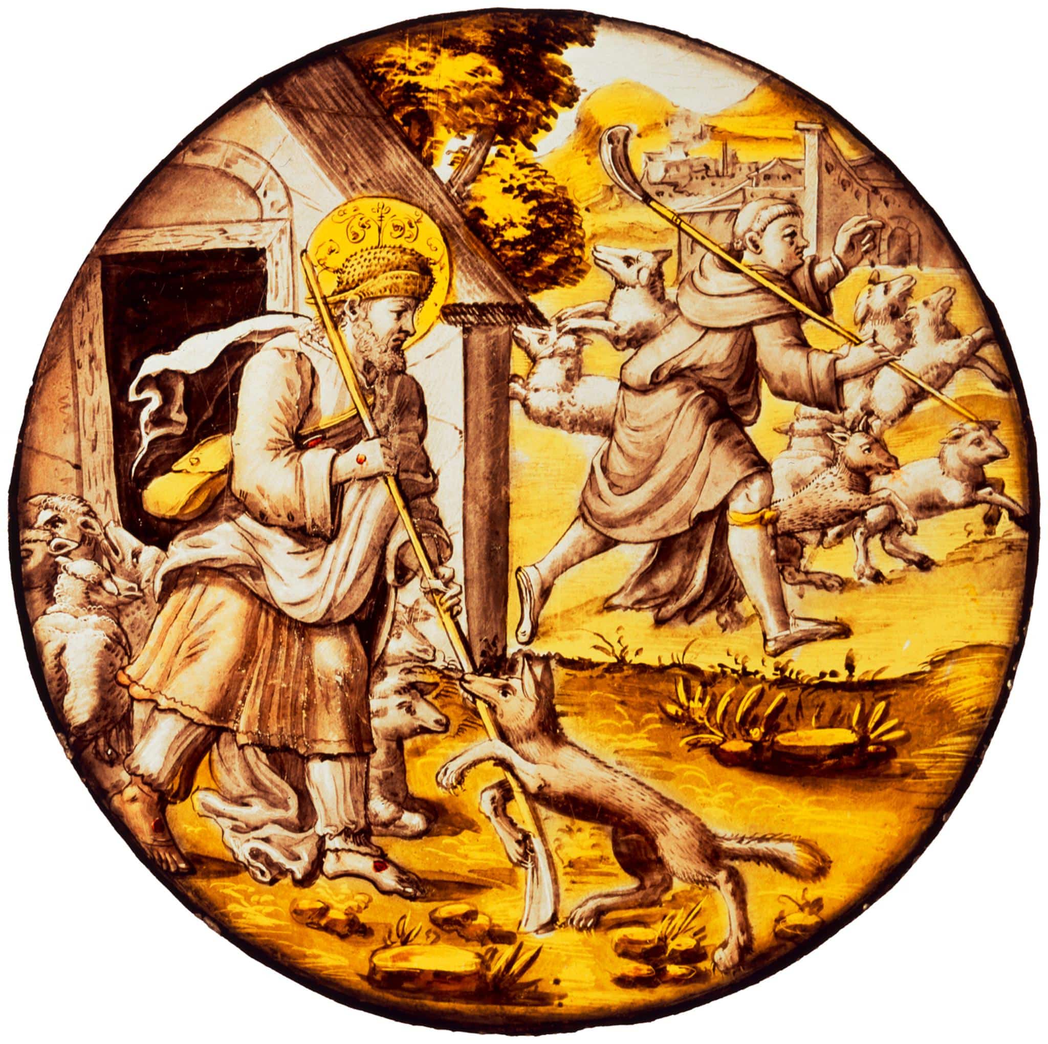 La provenance de ce rondel n’est pas établie. Celui-ci a été acheté en 2006 à Heidelberg par un collectionneur établi en Allemagne qui l’a vendu en 2019 au Vitrocentre Romont, avec 28 autres pièces, toutes datant des XVe et XVIe siècles et provenant des anciens Pays-Bas voire, pour quelques-unes d’entre elles, des pays germaniques (Romont, Vitromusée Romont, documentation, inv. VMR 911 et 10022, consultée le 4 avril 2022).Le rondel représente une scène néotestamentaire tirée de l’Evangile selon Jean, relatant la parabole du Bon Pasteur (Jn 10, 1-18) : „Moi, je suis le bon pasteur, le vrai berger, qui donne sa vie pour ses brebis. Le berger mercenaire n’est pas le pasteur, les brebis ne sont pas à lui : s’il voit venir le loup, il abandonne les brebis et s’enfuit ; le loup s’en empare et les disperse. Ce berger n’est qu’un mercenaire, et les brebis ne comptent pas vraiment pour lui. Moi, je suis le bon pasteur ; je connais mes brebis, et mes brebis me connaissent, comme le Père me connaît, et que je connais le Père ; et je donne ma vie pour mes brebis. J’ai encore d’autres brebis, qui ne sont pas de cet enclos : celles-là aussi, il faut que je les conduise. Elles écouteront ma voix : il y aura un seul troupeau et un seul pasteur. Voici pourquoi le Père m’aime : parce que je donne ma vie, pour la recevoir de nouveau. Nul ne peut me l’enlever : je la donne de moi-même. J’ai le pouvoir de la donner, j’ai aussi le pouvoir de la recevoir de nouveau : voilà le commandement que j’ai reçu de mon Père“.