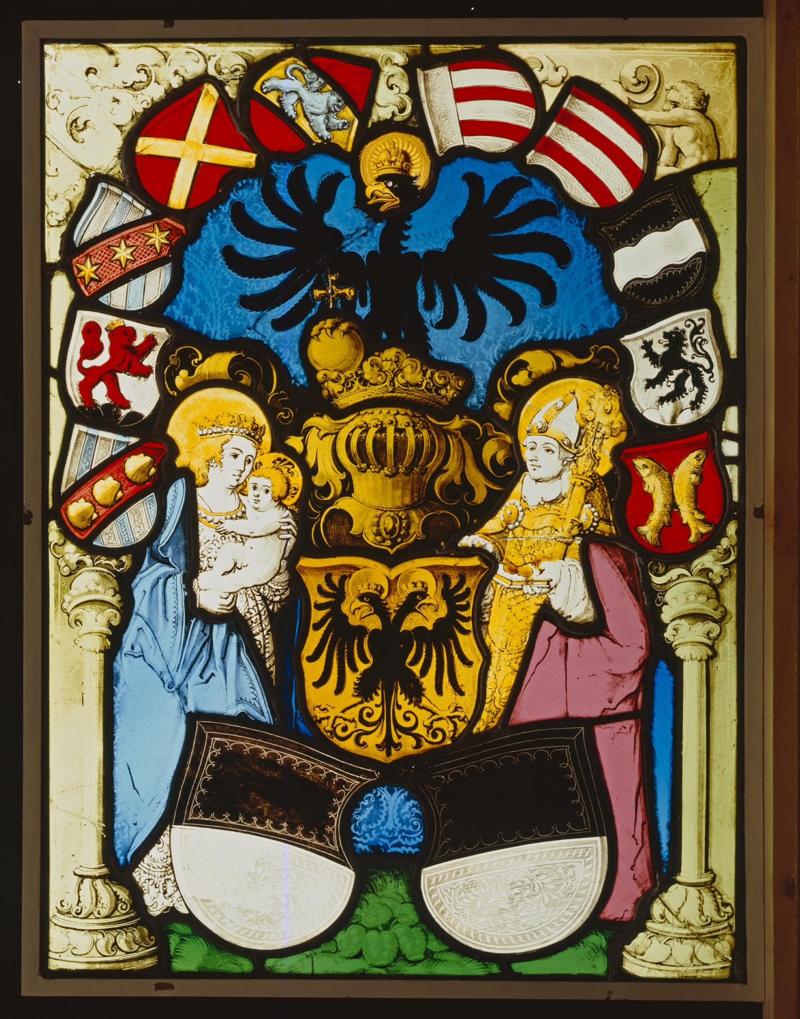 In einer Arkadenrahmung erhebt sich in blattbewachsener Wiese vor blauem, hobelspangemustertem Damastgrund die Wappenpyramide Freiburg-Reich und darüber der Reichsadler auf dem bekrönten Spangenhelm mit dem Reichsapfel in seinen Krallen. Als Schildbegleiter die Freiburger Standespatrone, links die den Jesusknaben haltende Muttergottes in blauem Mantel und rechts der hl. Nikolaus in weiss-goldner und hellpurpurner Pontifikaltracht sowie mit den drei Goldkugeln (Äpfeln) auf dem Buch in seinen Händen, womit er drei arme Mädchen aus ihrem Elend errettete. Am Arkadenbogen sind von links nach rechts die zehn folgenden Freiburger Ämterwappen aufgereiht: Grandson, Murten, Chenaux, Illens, Pont-en-Ogoz, Montagny, Everdes, Plaffeien, Grasburg, Orbe.