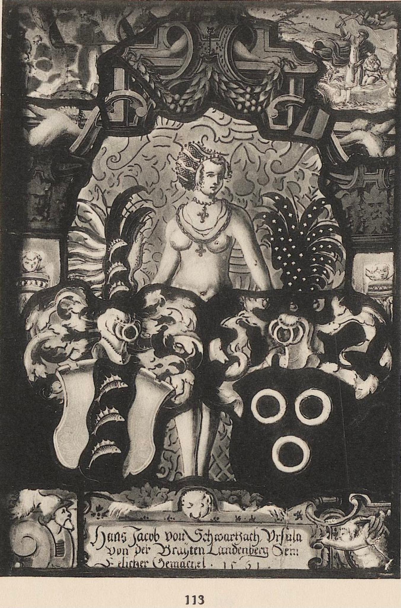Wappen, Schwarzach, Hans Jakob von: (In Silber schwarzer) Wellenpfahl, belegt mit drei (silbernen) Fischen; Spangenhelm; Helmdecke: (schwarz und silbern); Helmzier: halber (silberner) Flug mit dem Schildbild. Wappen Breitenlandenberg, Ursula von: (In Rot) drei (silberne) Ringe (2, 1); Spangenhelm; Helmdecke: (rot und silbern); Helmzier: (schwarzer) Flug, bestreut mit (silbernen) Lindenblättern.
