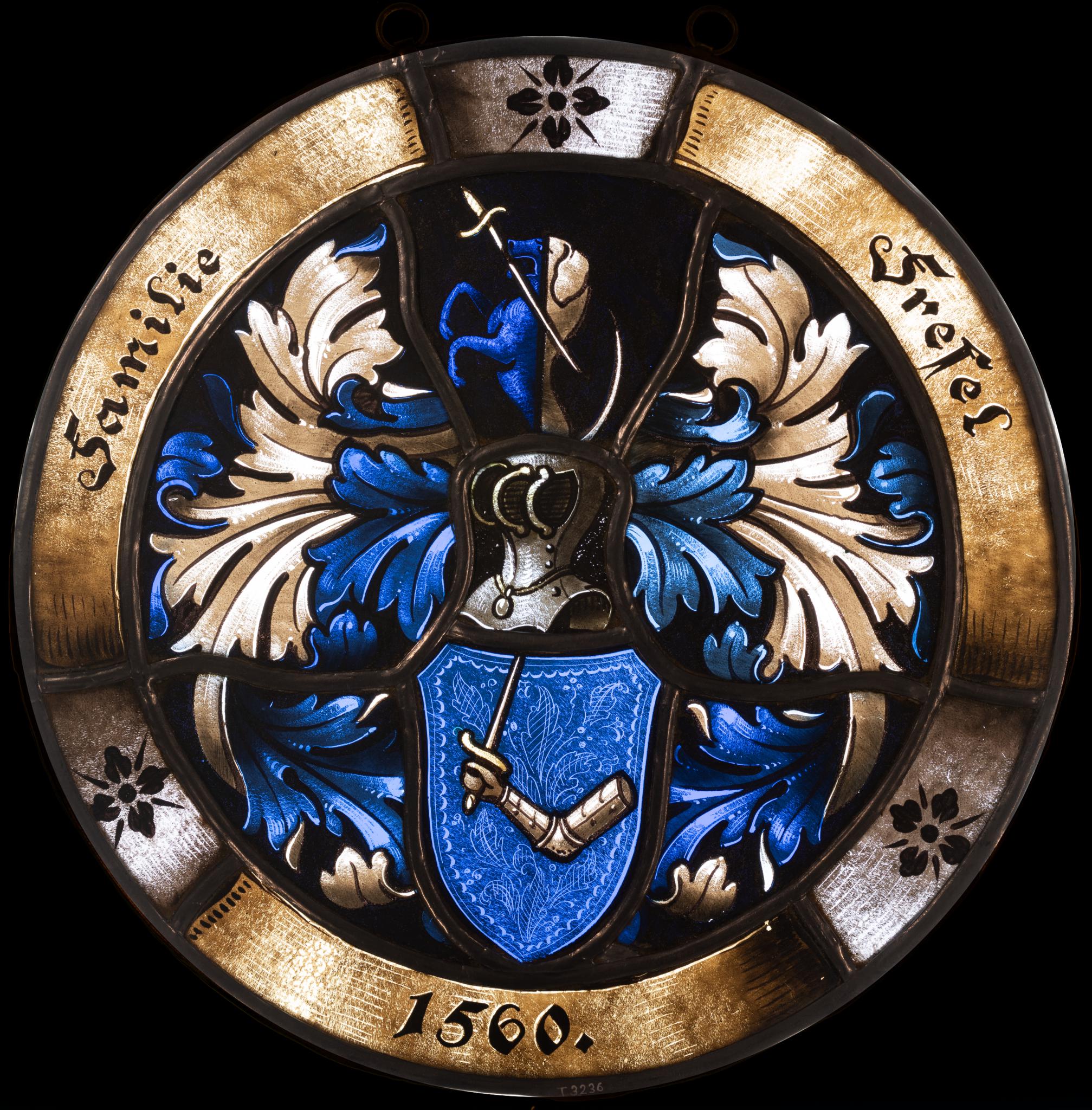 Die runde Wappenscheibe zeigt das Vollwappen Frefel: Im unteren Bereich ist das Wappenschild dargestellt. Darüber folgt ein silberner Bügelhelm mit goldenen Bügeln und goldenem Halskleinod und ein wachsender blau-goldener Hund mit einem Schwert im Maul. Rechts und links befindet sich die blau-goldene Helmdecke.
