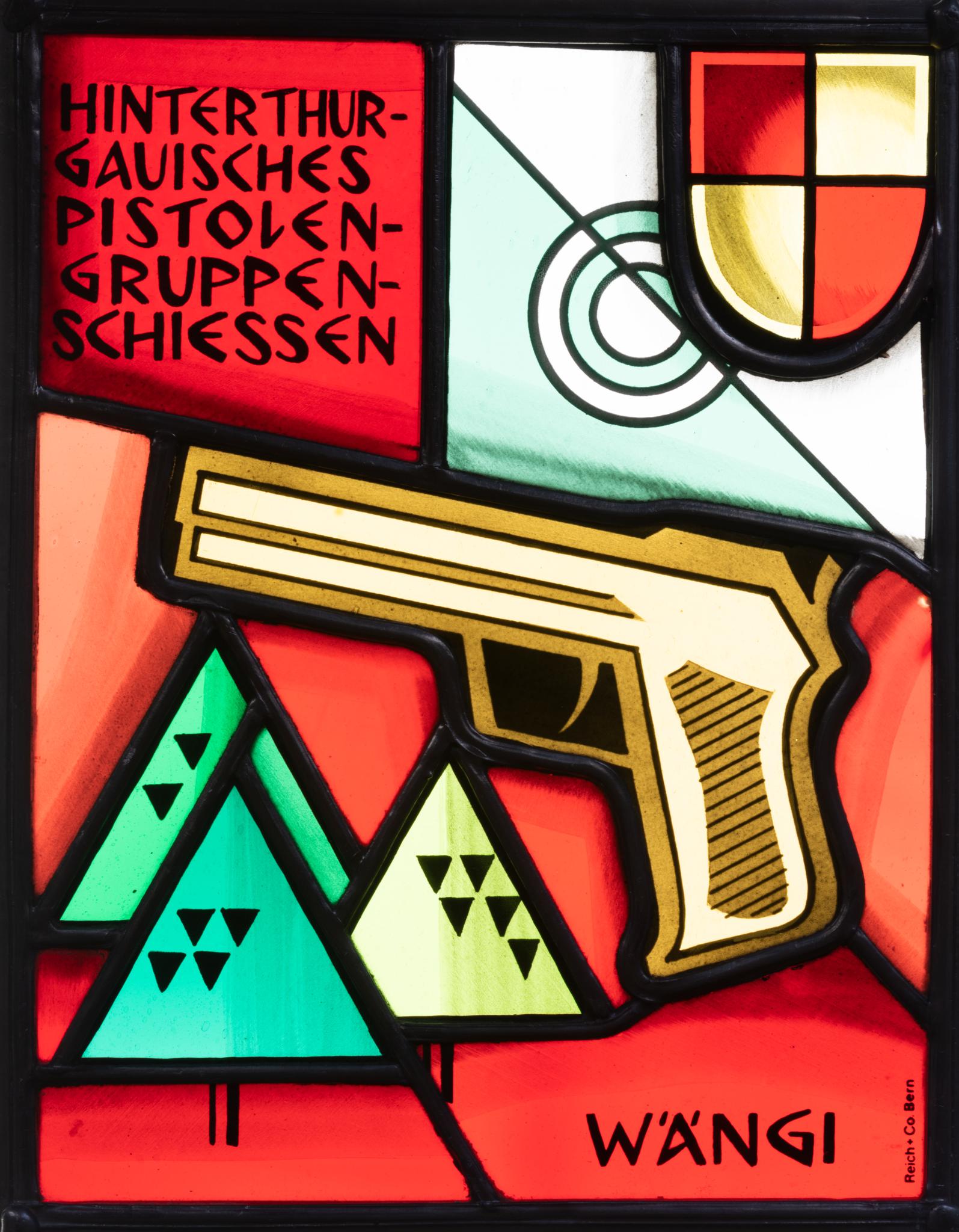 Die rechteckige Scheibe zeigt auf rotem Grund eine Pistole, den Griff rechts. Unten links sind drei stilisierte Tannen, oben rechts im Hintergrund eine Zielscheibe auf farblosem und hellgrünem Grund, darauf das Wappen von Wängi.