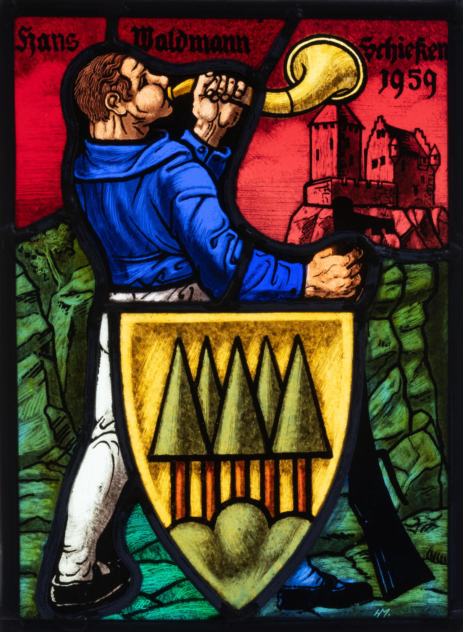 Die hochrechteckige Scheibe zeigt in seitlicher Rückenansicht die Darstellung eines in eine weisse Hose und ein blaues Hemd gekleideten Mannes, der mit seiner linken Hand ein Jagdhorn hält und in dasselbe bläst. Mit seiner Rechten hält er eine Büchse, die auf dem Boden abgestützt ist. Er befindet sich in grüner Landschaft mit Vegetation und Felsen, der Hintergrund darüber ist rot. Rechts oben befindet sich die Ansicht einer Burg. Vor dem Unterkörper der Figur ist das Wappen von Hans Waldmann eingefügt.