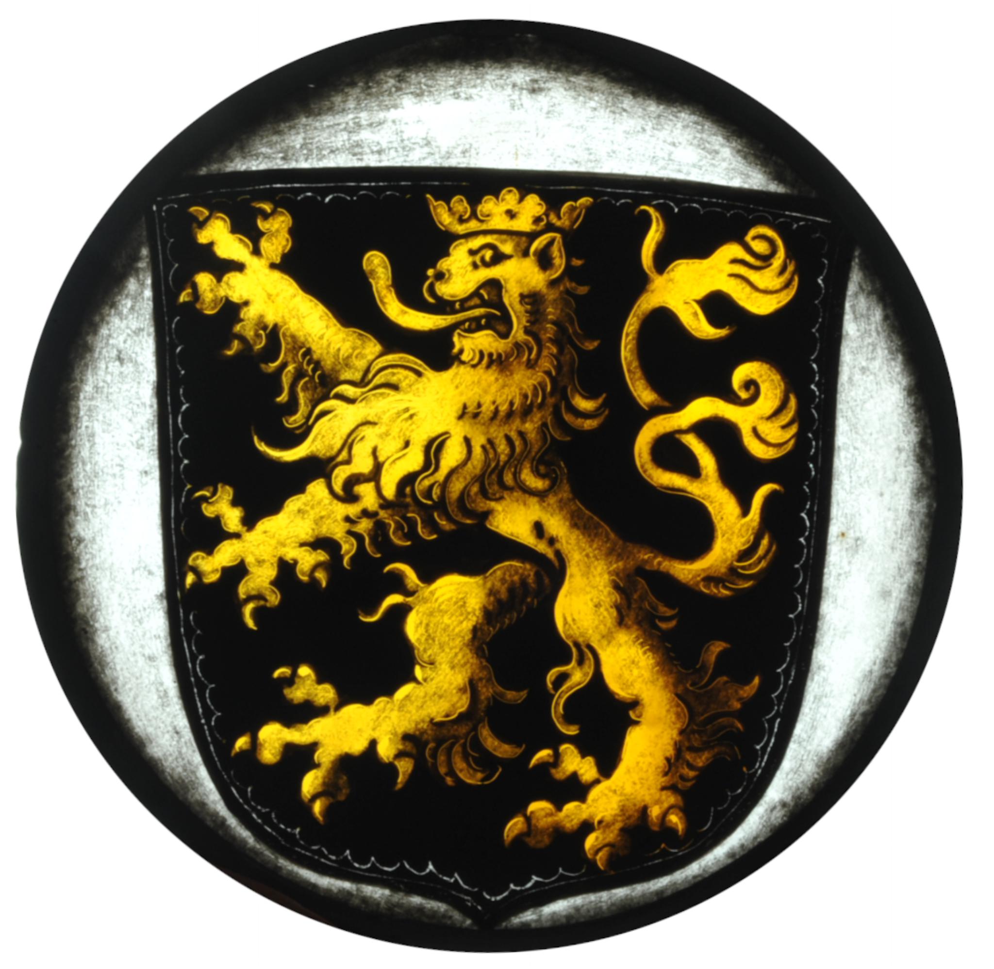 Darstellung eines Wappens mit einem goldenen bekrönten doppelschwänzigen Löwen.
