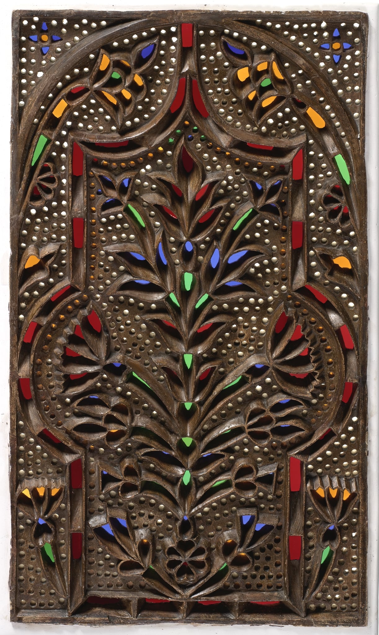 Based on these photographs and the presumed date of the windows, one may assume that the windows were created especially for Delort de Gléon’s Arab-style interior and had never been part of a historical building in Cairo. The complete history of these windows however, including possibly multiple reuses and several restorations, is difficult to reconstruct. Based on the unpublished study by Bailly et al. (2008) and our own observations, it seems that most of the windows have been cut from their wooden frames. Extensive repairs to the stucco grille, as well as the partial or complete replacement of the thin plaster layer for embedding the pieces of glass at the backs of the panels, are proof of several restoration campaigns. It is likely that the brown paint on the stucco lattice is not original, but was applied during restoration, with the intention of adapting the windows to new surroundings. It may be the result of a restoration campaign before the Louvre exhibition in 1977, and may have been applied to match the colour of the wooden mashrabiyya in which the windows were displayed.
