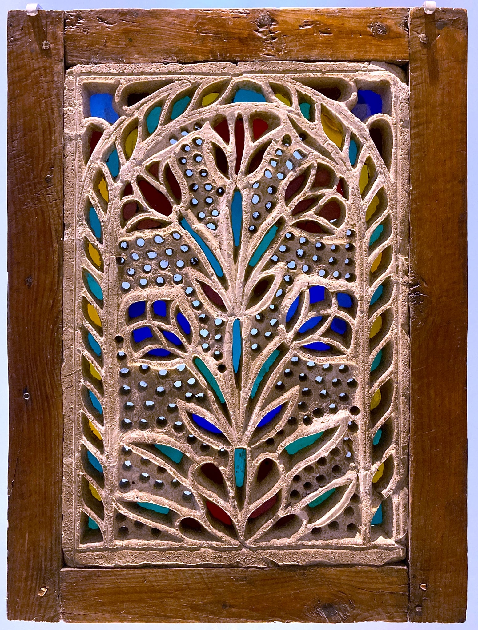 The window was made according to the traditional technique used in the manufacture of qamarīyāt in North Africa until today. Firstly, the rectangular stucco panel was produced by pouring gypsum plaster into a wooden frame. The average thickness of the stucco is c.30mm. Once the stucco had set, the latticework was carved out with sharp, knife-like tools. Then the openings were then covered with pieces of colourless and coloured sheet glass, which were fixed on the back of the lattice with a thin layer of gypsum plaster.