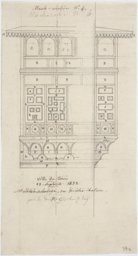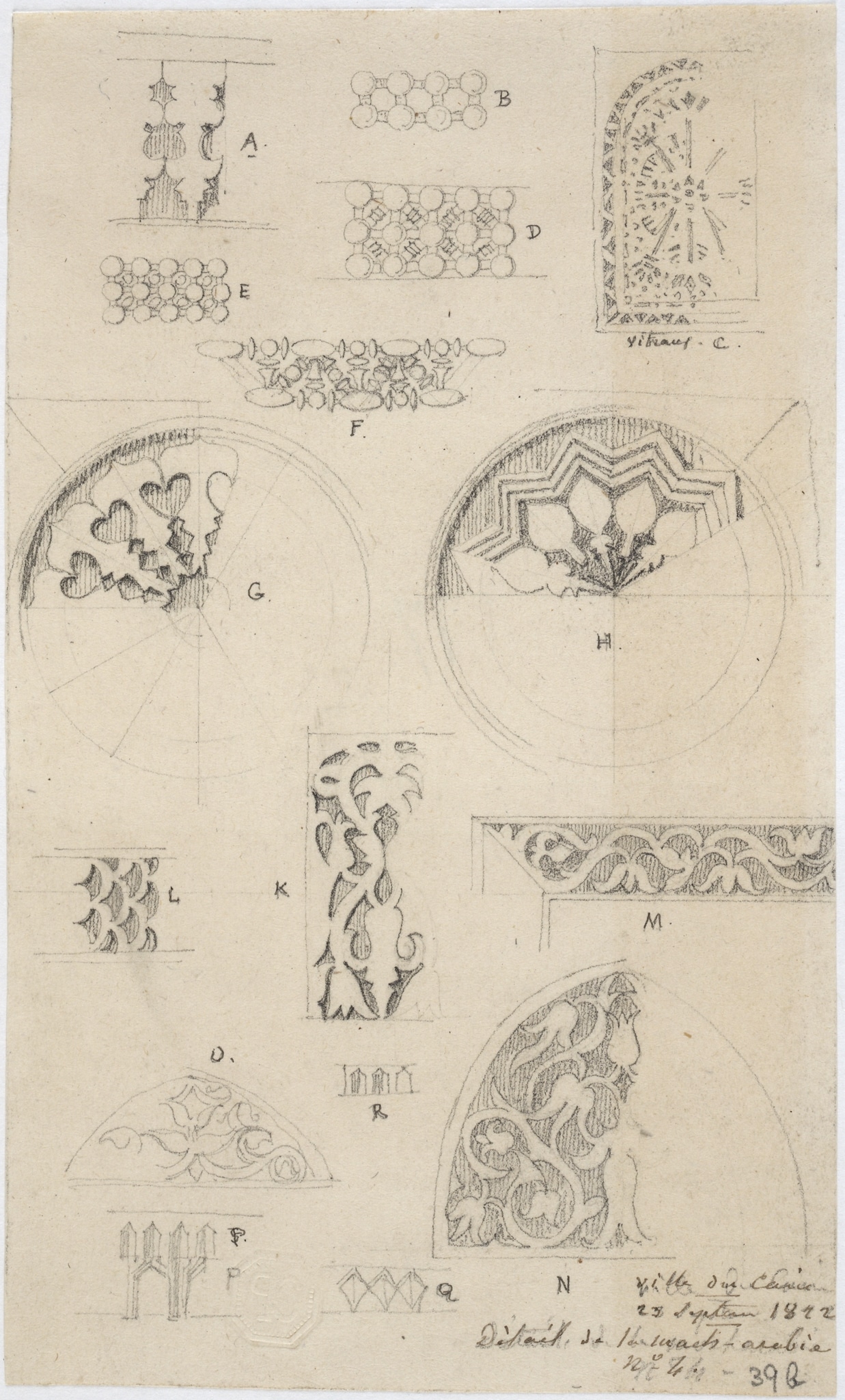 Between 1818 and 1827, Pascal Coste documented the buildings in Cairo extensively, among them many private houses. The details shown here are part of a mashrabiyya represented in a second drawing (MS1311_f39a, see Linked objects and images). Letters indicate the placement of the architectonical details. In difference to other of his drawings which relate directly to the plates published in 1837 in Architecture arabe ou Monuments du Kaire, mesurés et dessinés, de 1818 à 1826, this mashrabiyya is not represented in the book. Coste gives no information about it.
