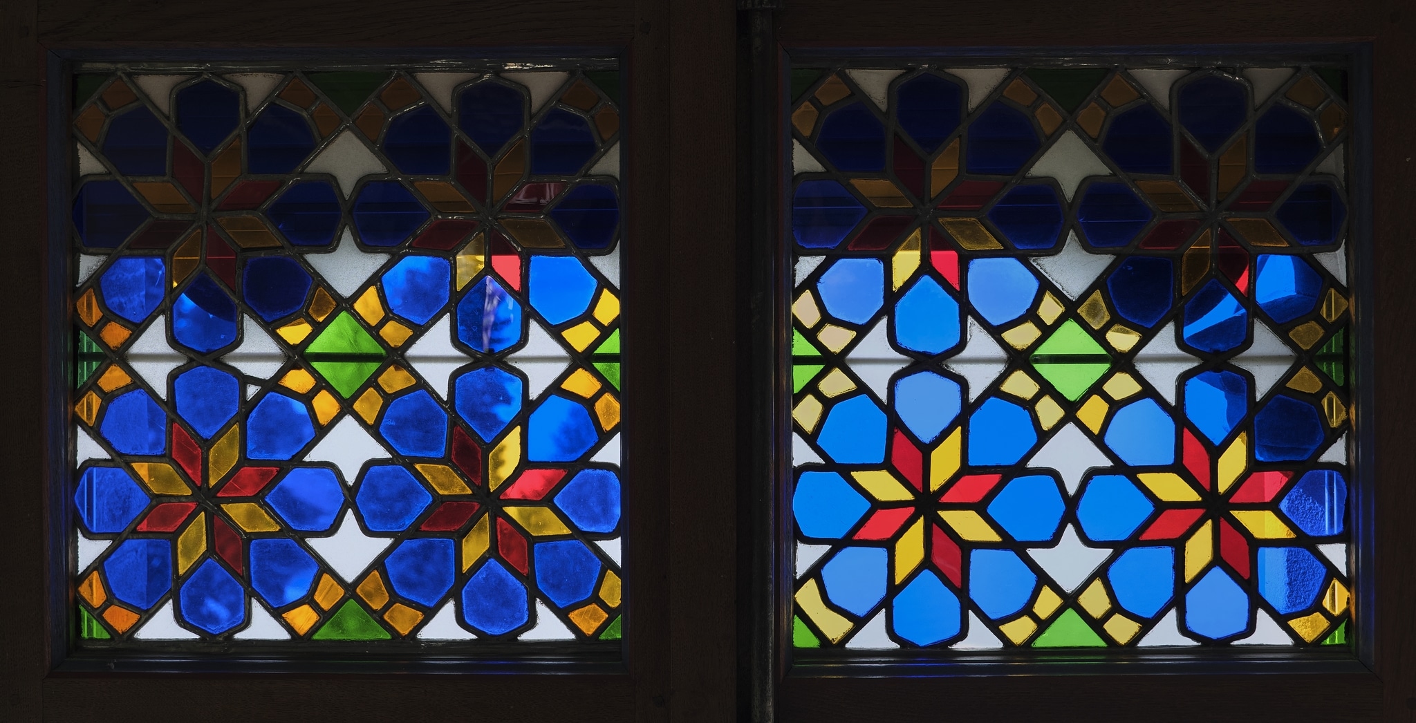 The stained glass panels show a slightly modified version of the flower and star ornamentation documented in several of the stucco and glass windows studied from Egypt (see for instance IG_12, IG_38, IG_167, IG_171, IG_186). In contrast to these windows, the eight-petalled flower set into the star has been replaced by a smaller eight-pointed star.