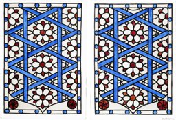 Wooden latticework replicating two identical stucco and glass windows. The design consists of symmetrically arranged ornamentation of alternating rows of circles and flowers. Two vertical and two zig-zag lines in blue form a geometric network. The ornamentation is framed by an ogee arch. Stylizised six-petalled flowers in red adorn the spandrels. A frame with alternating circles and rectangles surrounds the composition.