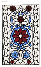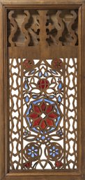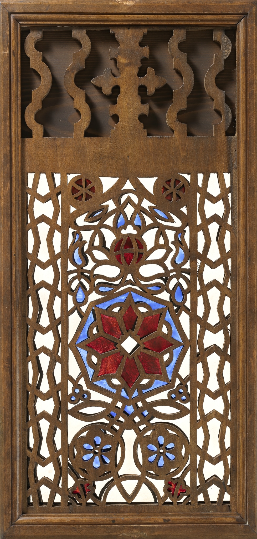 The centre of this wooden replica of a stucco and glass window is occupied by a red eight-pointed star. The star is surrounded by a white, eight-petalled flower and a blue octagon. Above the star is a globe-like sphere in red. Blue drops, perhaps petals, surround the sphere. Two six-petalled flowers in blue occupy the lower part of the window. An ogee arch frames the central field. Stylized six-petalled flowers in red adorn the spandrels. Two ornamental borders flank the central composition.