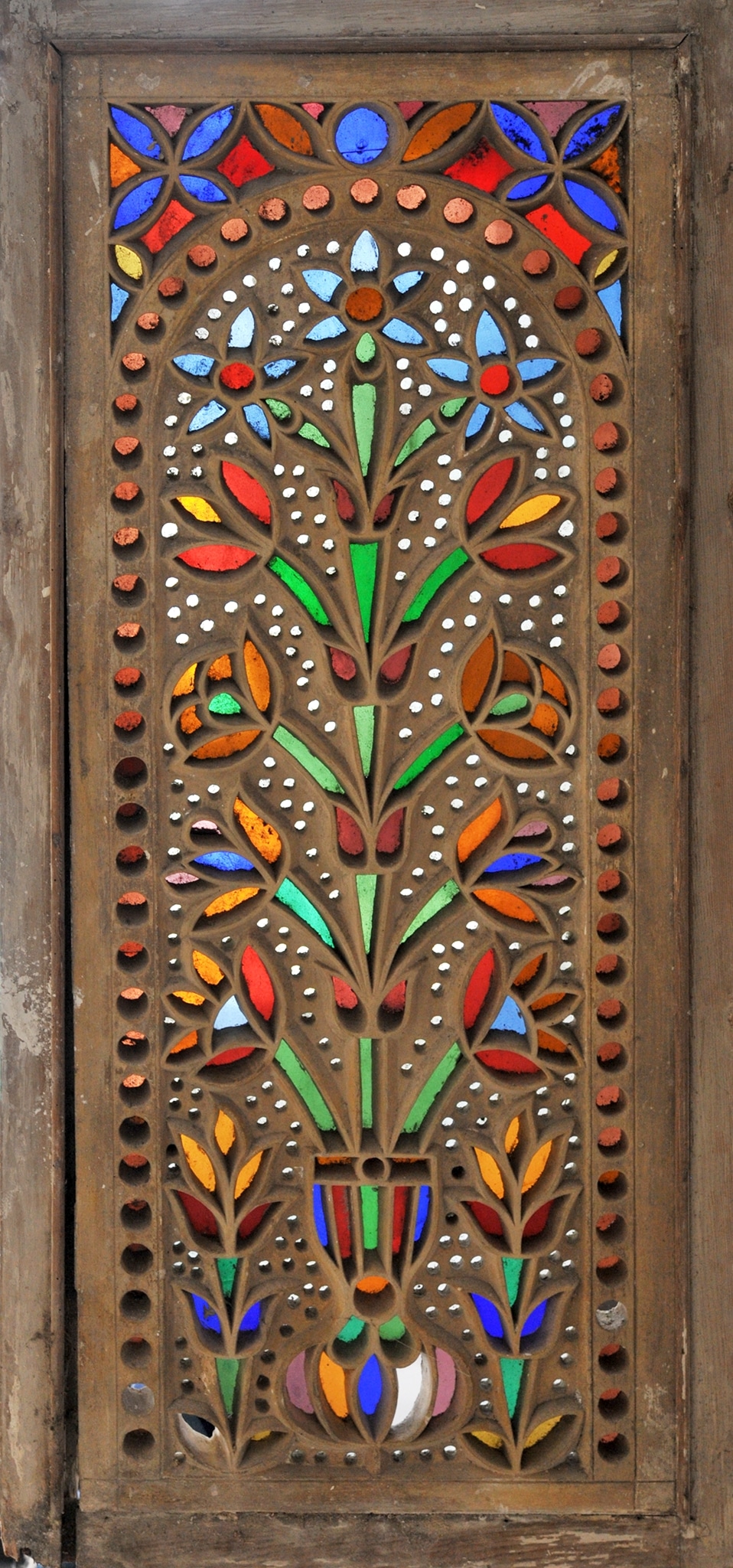From an iconographic point of view, this stucco and glass window corresponds to one of the standard types of qamariyya widespread in Egypt during the Ottoman period. Similar windows can be found in several of the collections studied (see for instance IG_7, IG_166, IG_178, IG_255, IG_356). The representation of flowers in a vase is a widespread motif in Islamic arts. It can be found in numerous other media, such as ceramics, wood panelling, wall paintings, and textiles, over a long period of time, and in both sacred and profane contexts. Depending on the quality of the design, the type of flower cannot always be identified. Among the most sophisticated examples of stucco and glass windows with the vase motif are those in the apartments of the Crown Prince at the Topkapı Sarayı (early 17th century CE, date of the windows uncertain) and those in the Sultan’s Lodge (Hünkâr Kasrı) of the Yeni Cami (1661–1663 CE, date of the windows uncertain), both in Istanbul.