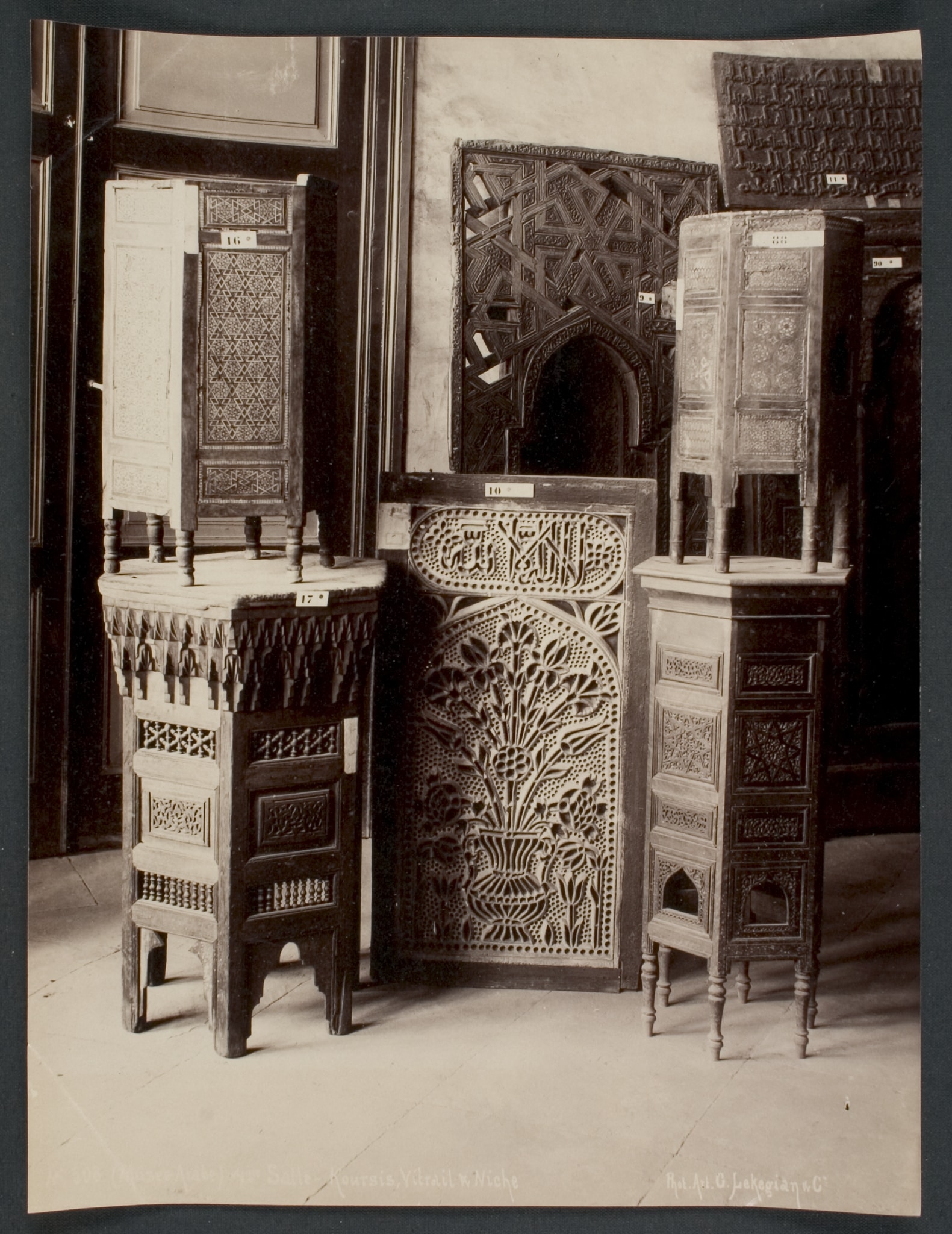This stucco and glass window was captured in its setting in the provisional museum in Cairo, the future Museum of Arab Art (Musée d’art arabe), today known as the Museum of Islamic Art (MIA). Removed from its original architectural context, the window is flanked on both sides by two wooden tables (in Arabic: karāsī) placed on top of each other. The building element and furniture were labelled and juxtaposed in a symmetrical arrangement and bear witness to a staging of the window in 19th-century photography. Lekegian also photographed the same window in isolation, without any architectural or museal context (IG_480). By comparing the two photographs, it can be deduced that he may have captured the same window in the two photographs, which both bear a label with the number ‘42’.