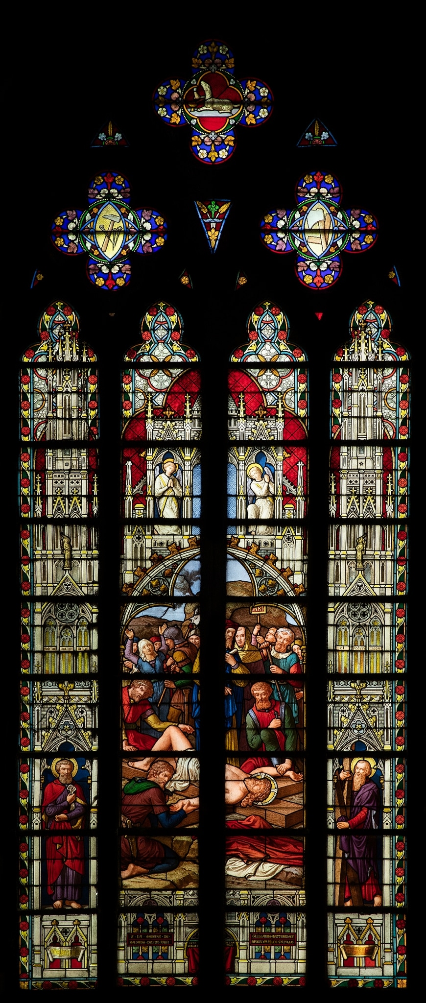 Masswerkfenster mit vier Lanzetten und Couronnement mit drei Vierpässen. In den beiden mittleren Lanzetten ist die 11. Station des Kreuzweges dargestellt: Der nur noch mit einem Lendentuch bekleidete Jesus Christus wird an das Kreuz genagelt. Im Hintergrund drängt ein Soldat die klagenden Frauen zurück. Die Bildszene ist von einer Rahmenarchitektur im Stil der Gotik gefasst, die mit Fialen und zwei betenden Engeln bekrönt ist. In den beiden äusseren Lanzetten sind als zur Rahmenarchitektur gehörende Statuen die Apostel Petrus und Andreas mit ihren Attributen Schlüssel und Andreaskreuz gezeigt. Der Sockel der Rahmenarchitektur ist mit Schriftbändern und Stifterinschriften geschmückt. Die oberen Enden der Lanzetten sind mit geometrischen Ornamenten, Grisaillemalerei und einer farbigen Rahmung mit Blatt- und Blütenmotiven gestaltet. In den Vierpässen sind ein Opferlamm und Leidenswerkzeuge (Nägel und Hammer sowie Axt und Winkel) auf ornamentiertem Hintergrund dargestellt.
