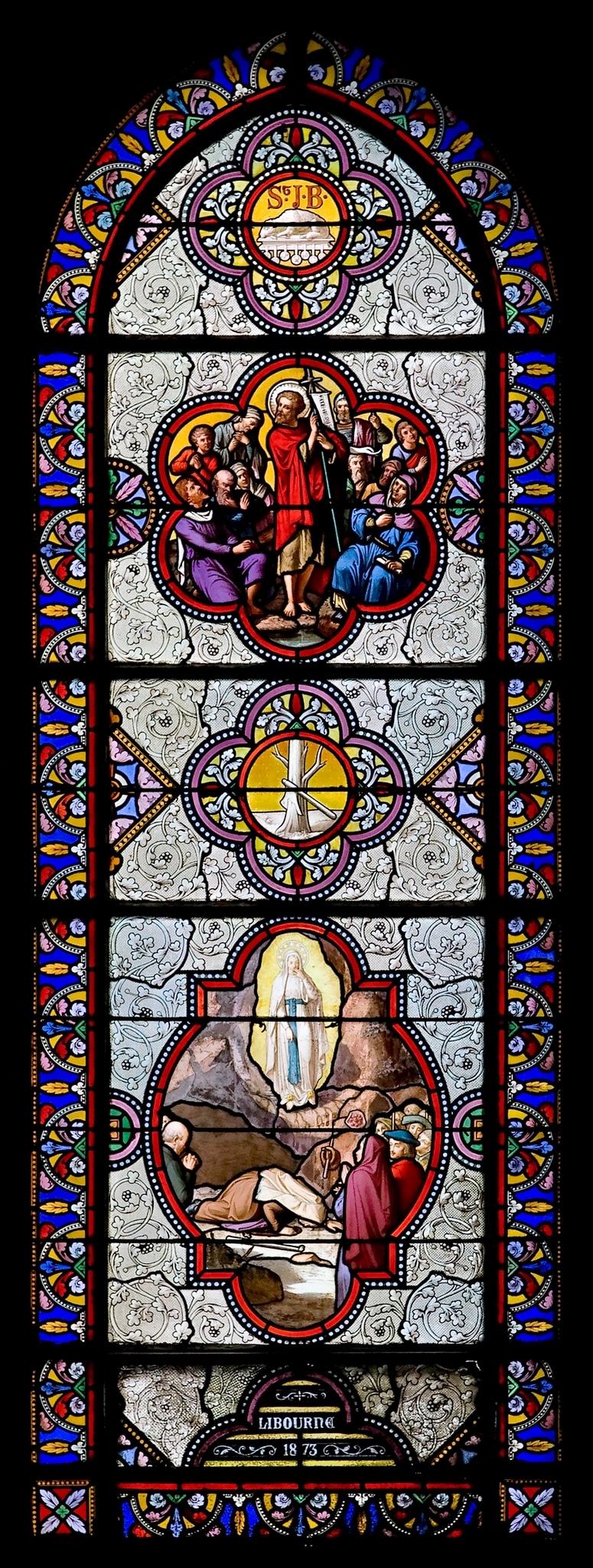 Spitzbogenfenster mit fünf übereinander angeordneten Medaillons. Das grösste Medaillon im unteren Bereich des Fensters ist Teil einer Chronik der Marienerscheinungen von Lourdes und dessen anschliessender Entwicklung zum Wallfahrtsort (1858–1876). Hier ist die sechste Erscheinung der Jungfrau Maria an die vierzehnjährige Bernadette Soubirous in der Grotte von Massabielle am 21. Februar 1858 dargestellt: Die weissgekleidete Jungfrau mit Schleier, blauem Gürtel und zwei goldenen Rosen auf den Füssen steht in einem Strahlenkranz auf einem Felsvorsprung; sie zeigt auf den Boden und fordert Bernadette auf, für die Sünder zu beten und zu büssen. Beobachtet von einer betenden Menschenmenge küsst das Mädchen den Boden, neben ihm liegt eine brennende Kerze. In Analogie dazu ist im oberen Bereich des Fensters in einem Sechspass Johannes der Täufer am Jordan gezeigt, der eine Menschenmenge zur Busse aufruft (Mt 3, 1–3). Er hält einen Kreuzstab mit Banner, auf dem Jesus Christus, der die Sünde der Welt hinwegnehmen wird, als Lamm Gottes bezeichnet wird. Darüber erscheint in einem Vierpass das Monogramm des Täufers – ihm ist auch die Kapelle gewidmet, in der sich das Fenster befindet –, begleitet vom Lamm auf dem Buch mit den sieben Siegeln. Der stehende Vierpass im Zentrum des Fensters ist mit einem passenden theologischen Symbol geschmückt, hier einer Axt an der Wurzel eines Baumes, ein Verweis auf eine Passage aus der Predigt Johannes des Täufers (Mt 3, 10). Am Fuss des Fensters halber Vierpass mit Stifterinschrift. Die Medaillons liegen auf einem mit Blüten- und Blattranken in Grisaille dekorierten Grund; ein im Stil der Gotik mit farbigen Blattornamenten gestalteter Rahmen fasst das Fenster ein.