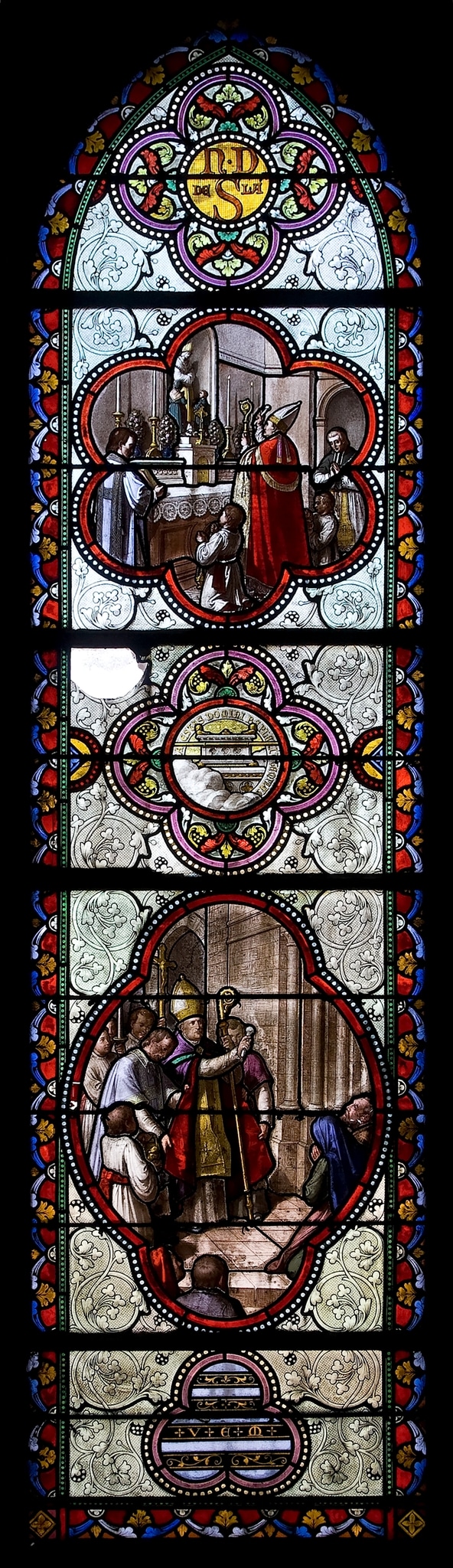 Eine von 41 Glasmalereien in der Basilika der Unbefleckten Empfängnis in Lourdes, die zu Ehren der Jungfrau Maria über der Grotte von Massabielle erbaut wurde. Dort soll die Jungfrau von Februar bis Juli 1858 insgesamt achtzehn Mal der 14-jährigen Bernadette Soubirous (1844–1879) erschienen sein. Die Glasmalereien der Kapellen in Langhaus und Chor berichten von diesen Erscheinungen und weiteren religiösen Höhepunkten in Lourdes Entwicklung zum wichtigsten Wallfahrtsort Frankreichs. Sie werden nach Eintritt in die Kirche von links nach rechts im Uhrzeigersinn gelesen. Die Glasmalereien im Obergaden von Langhaus und Chor thematisieren den Glauben an die unbefleckte Empfängnis (immaculata conceptio), von biblischen Präfigurationen bis zur Verkündung des Dogmas durch Papst Pius IX. am 8. Dezember 1854: seine Bulle Ineffabilis Deus hielt fest, dass die Jungfrau Maria ohne den Makel der Erbsünde empfangenen worden sei. Die Fenster im Obergaden werden zuerst von links zum Chor hin gelesen und danach von rechts zum Chor hin. Durch die Orgel verdeckt ist das Rosenfenster mit Mariensymbolen (?) in der Hauptfassade.
