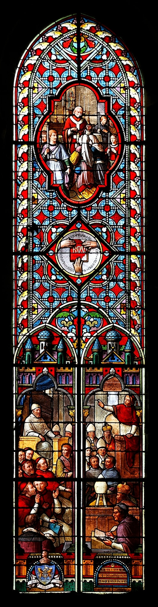 Spitzbogenfenster mit einer Bildszene in der unteren Hälfte des Fensters und darüber zwei Bildmedaillons auf einem im Stil der Gotik ornamentierten farbigen Hintergrund. Das Fenster ist Teil eines Zyklus zum Dogma der Unbefleckten Empfängnis Marias (immaculata conceptio). Der Zyklus thematisiert einerseits die Ankündigung des Mysteriums durch Präfigurationen Marias, und andererseits den Glauben an das Mysterium von seinen Anfängen bis zur Verkündung des Dogmas durch Papst Pius IX. am 8. Dezember 1854. Hier ist prominent eine Debatte zwischen Bischöfen und Gelehrten am Konzil von Trient 1546 unter dem Vorsitz von Kardinal Giovanni Maria Ciocchi Del Monte (dem späteren Papst Julius III.) dargestellt. Im Dekret zur Erbsünde wird schliesslich festgehalten, dass jeder Mensch von Geburt an mit der Erbsünde befleckt sei, ausser Maria, die «unbefleckt empfangen» wurde. Die Bildszene ist über einem architektonischen Sockel mit Stifterwappen und Stifterinschrift platziert und von schmalen Säulen und Baldachinen eingerahmt. Darüber erscheint in einem kleinen Medaillon ein Buch mit der Aufschrift «Credo B. M. V. immaculatam», auf dem drei Hände liegen. Die Namen drei berühmter Universitäten in Paris, Köln und Salamanca, an denen dieser Eid üblich war, sind rundherum angeordnet. Im zweiten, darüberliegenden Medaillon ist ein Geistlicher mit Ministranten vor einem Altar gezeigt. Vor ihm knien zwei Frauen, von denen eine das blaue Skapulier der Unbefleckten Empfängnis trägt, womit sie die lebendige Tradition der Verehrung der immaculata conceptio in der Kirche verkörpert.