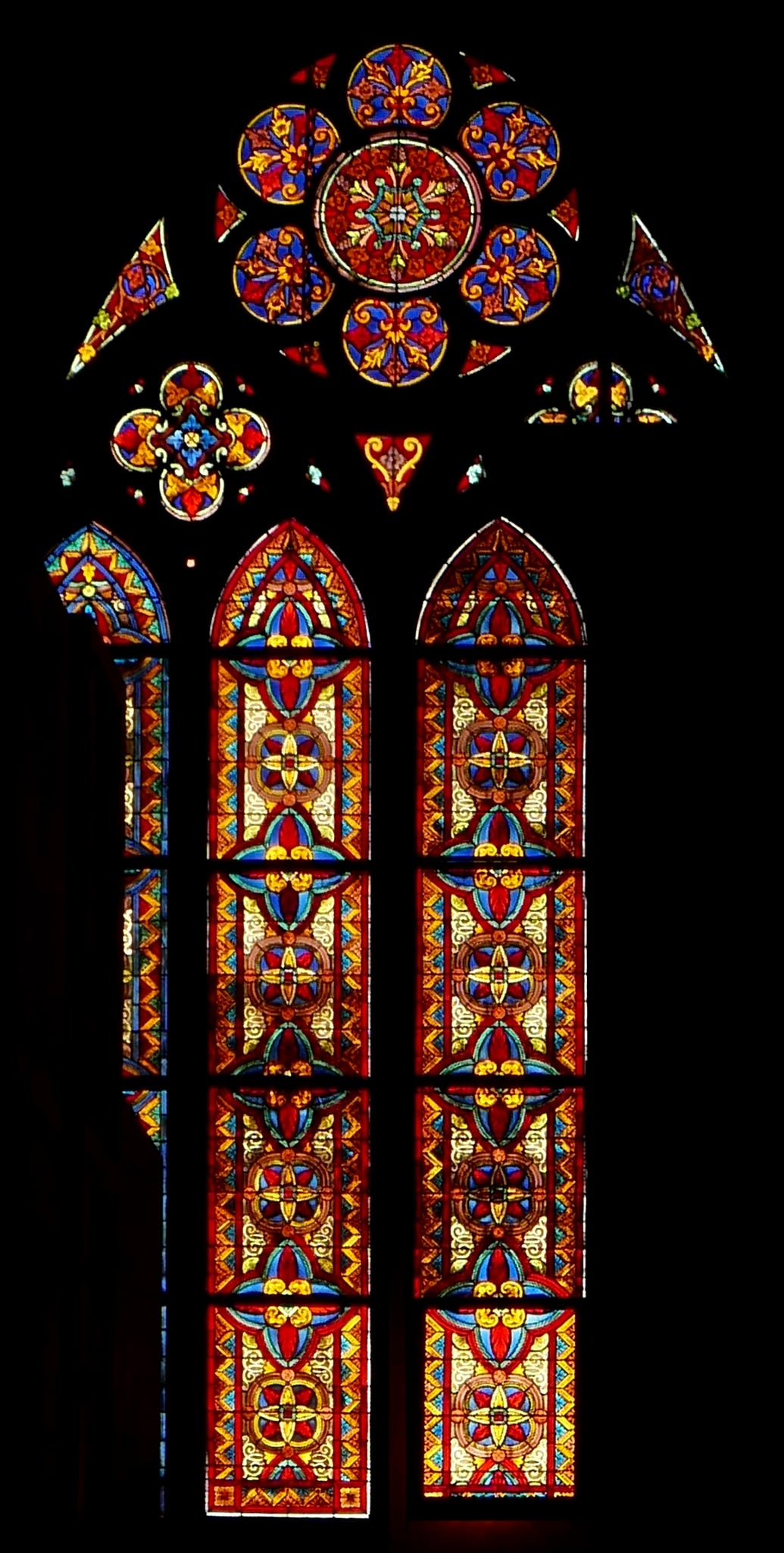 Masswerkfenster mit vier spitzbogigen Lanzetten; darüber im Couronnement zwei stehende Vierpässe und eine Rose. Die Lanzetten sind mit sich wiederholenden geometrischen Formen (Medaillons mit Sternmuster und stehende Vierpässe) auf in Grisaille ornamentiertem Grund besetzt, umgeben von einem farbigen Rahmen mit Zickzackmuster. Die Vierpässe und die Rose sind mit konzentrisch angeordnetem Blattwerk geschmückt, die übrigen Masswerkspickel mit Blattrankendekor. Es dominieren die Grundfarben Gelb, Blau und Rot.