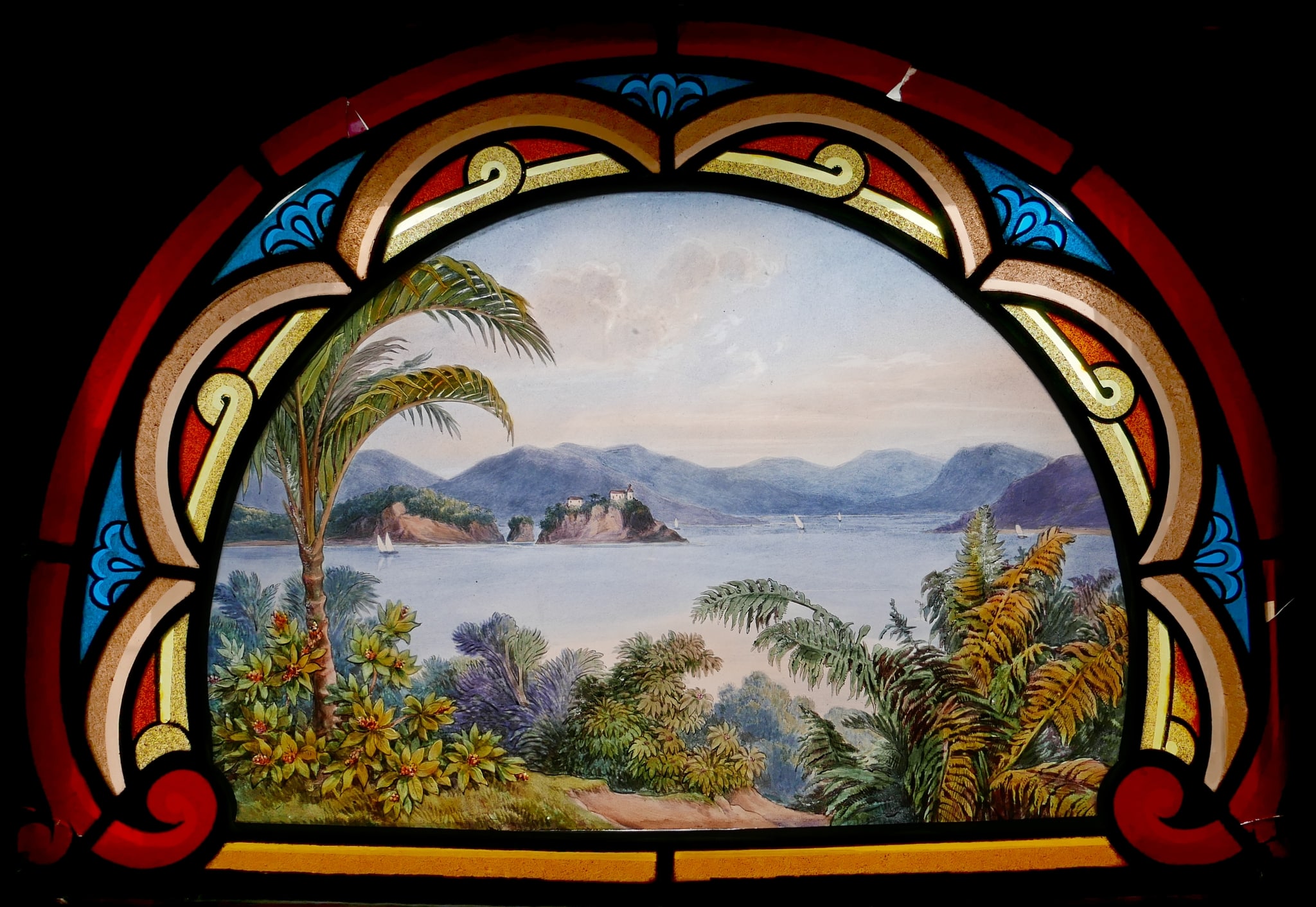 Glasmalerei in der Form eines Kreissegments, die ursprünglich wohl im oberen Bereich eines Fensters oder einer Tür angebracht war. Dargestellt ist eine Meerlandschaft in Brasilien bei Rio de Janeiro, mit Inseln und Hügelzügen im Hintergrund und üppigen Pflanzen im Vordergrund. Auf der Wasserfläche sind mehrere Segelboote zu sehen, auf einer Insel einzelne Gebäude und ein Leuchtturm. Die Bildszene ist in einen ornamentalen Rahmen in Rot, Gelb und Blau gefasst.