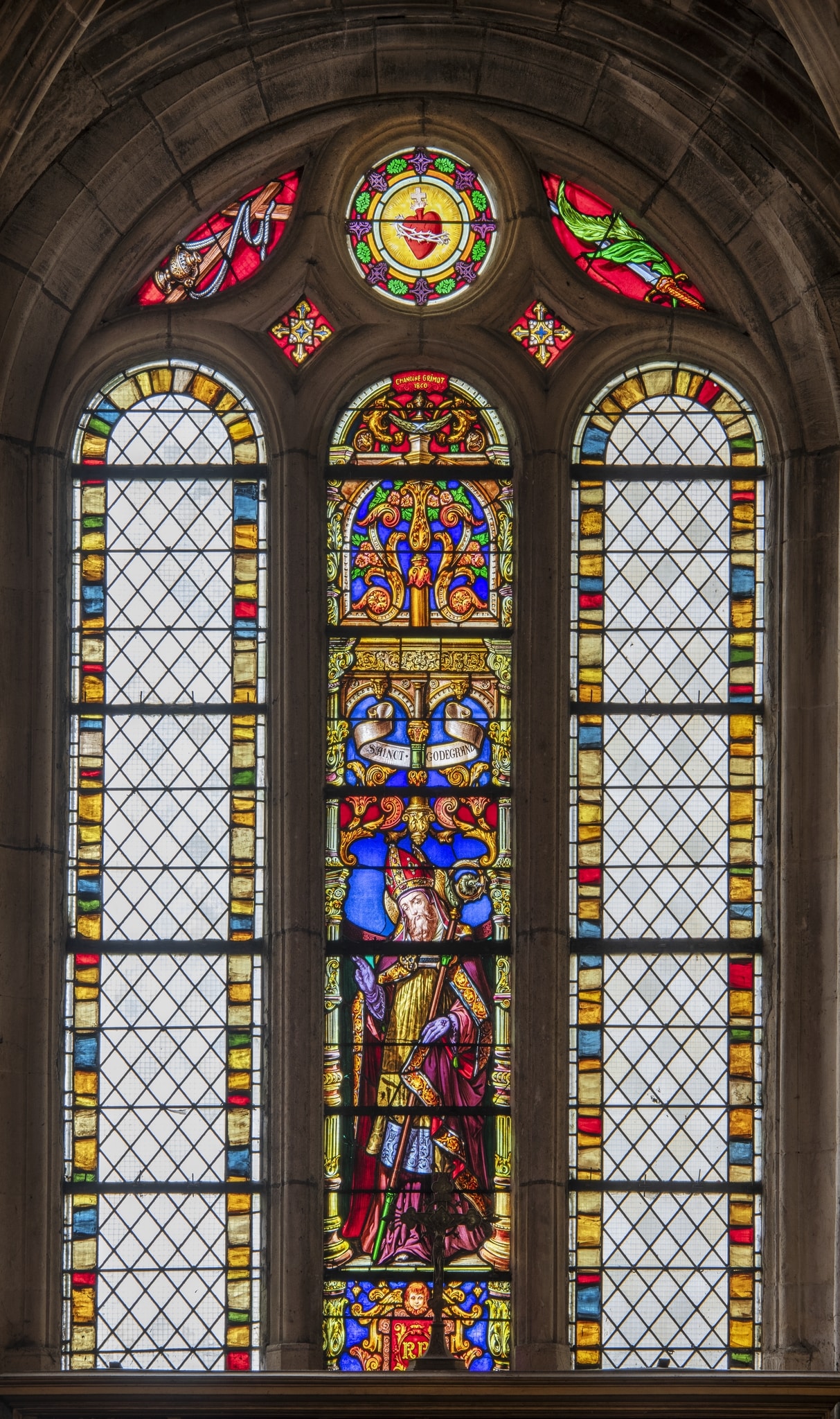 Masswerkfenster mit drei in Rundbogen endenden Lanzetten, darüber Couronnement mit Rundfenster. In der mittleren Lanzette ist in einem architektonischen Rahmen vor blauem Hintergrund der heiligen Chrodegang (um 715–766), Bischof von Séez, in reichem Ornat mit Pontifikalhandschuhen, Mitra und Bischofsstab dargestellt. Seine rechte Hand ist zum Segen erhoben. Über dem Heiligen erscheint ein Schriftband mit seinem Namenszug, das obere Drittel der Lanzette ist mit architektonischem Dekor sowie Blatt- und Blütenranken ausgefüllt. Das unterste Feld ist als architektonischer Sockel mit Schriftkartusche und einem Engelskopf gestaltet. Die beiden seitlichen Lanzetten sind mit blanken Rauten und farbigen Rahmen verglast. Im Couronnement erscheint das mit der Dornenkrone umkränzte Herz Jesu, sowie als Masswerkfüllungen ein Kreuz mit Weihrauchgefäss und ein Schwert mit Palmzweig als Hinweis auf das Martyrium des Heiligen.