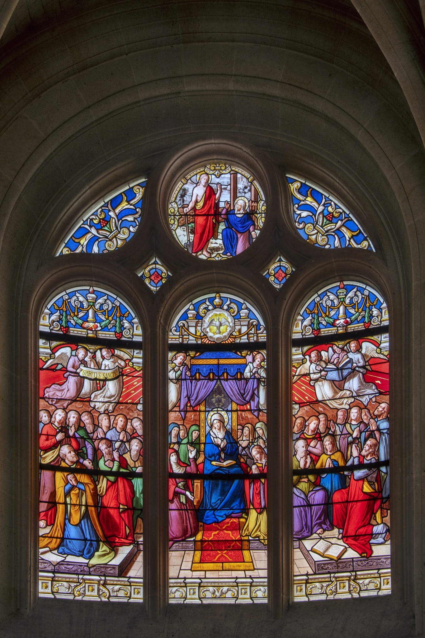 Masswerkfenster mit drei in Rundbogen endenden Lanzetten, darüber Couronnement mit Rundfenster und vier Masswerk-Zwickeln. Unter Baldachinen im Stil der Renaissance ist in den Lanzetten das Pfingstfest und Pfingstwunder (Apg 2, 1–4) dargestellt. Im Zentrum thront betend die in einen blauen Mantel gehüllte Maria mit über der Brust gekreuzten Armen und einem Buch auf dem Schoss. Sie ist umgeben von betenden Aposteln und Jüngern, über die sich – in Form von gelben Strahlen und Flammen, ausgehend von einer Taube in einem Wolkenkranz – der Heilige Geist herabsenkt. Acht Engel schweben über der Menschenmenge. Die drei Engel auf der linken Seite tragen ein Schriftband, die drei Engel auf der rechten Seite ein Buch, im Zentrum raffen zwei Engel den Vorhang, der am Baldachin über Maria befestigt ist. Der unterste Bereich der Lanzetten ist als schmaler architektonischer Sockel gestaltet. Im Couronnement ist, von einem ornamentalen Rahmen eingefasst, die Begegnung Maria Magdalenas mit dem auferstandenen Christus (Noli me tangere, Jh 20, 11–18) gezeigt. Der Auferstandene hält in der einen Hand eine Schaufel, die andere ist in einem lehrenden Gestus erhoben. Masswerk-Zwickel mit ornamentalen Füllungen.