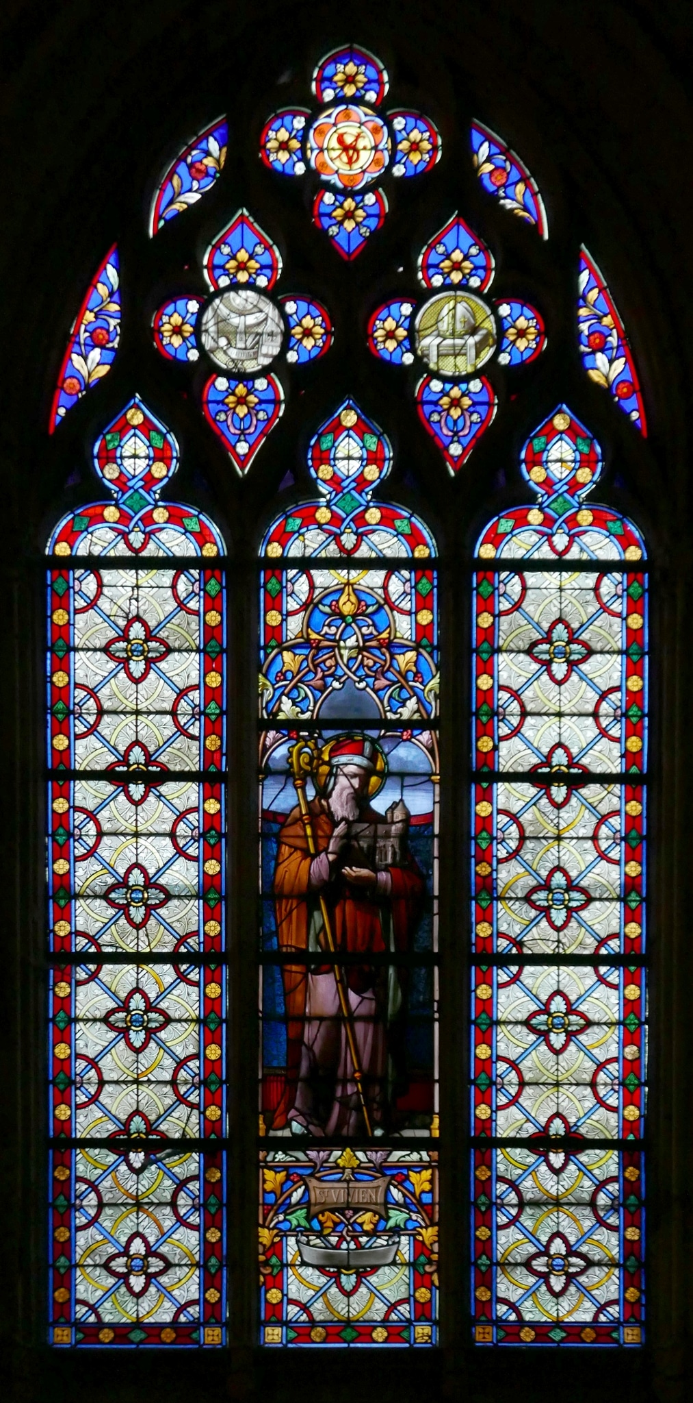 Eine von fünf Glasmalereien im südlichen Seitenschiff der Kirche Saint-Vivien in Rouen (CG_157–CG_161), die 1875 gestiftet wurden und aus dem Glasmalerei-Atelier Gsell-Laurent in Paris stammen. Vier dieser Fenster zeigen Heiligenfiguren, während das fünfte, über dem Seitenportal angebrachte, mit Christussymbolen geschmückt ist.