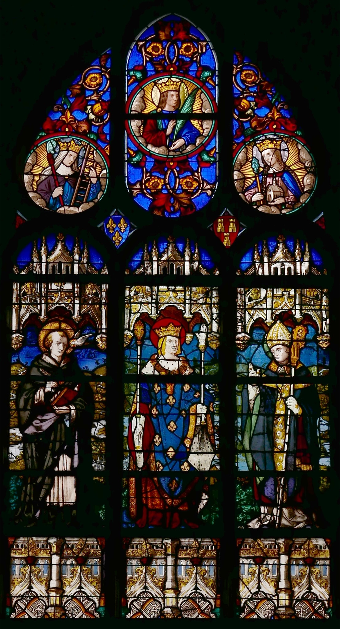 Dreilanzettiges Masswerkfenster mit den Ganzfiguren dreier Heiliger. In der Mitte ist König Ludwig IX. (1214–1270) mit Krone und in einem blauen Mantel mit goldenen Lilien und Hermelinbesatz gezeigt. Er trägt die Halskette des Michaelsordens und in den Händen das Zepter und die Hand der Gerechtigkeit der französischen Könige. Links ist der Kirchenlehrer Thomas von Aquin (1225–1274) im schwarzen Mantel des Dominikaners dargestellt. Er schreibt in ein Buch, während ihm eine Taube, seine Weisheit symbolisierend, ins Ohr flüstert. Bei dem rechts gezeigten Bischof in vollem Ornat handelt es sich vermutlich um Wilhelm von Auvergne (1180–1249). Er hält in der einen Hand den Stab, während die andere (mit Pontifikalhandschuh und Bischofsring) zum Segen erhoben ist. Die drei Heiligen stehen auf architektonischen Sockeln vor einer Fluss- und Berglandschaft und sind von Baldachinen im Stil der Gotik überfangen. In den Masswerkspickeln das Wappen Frankreichs mit drei Lilien auf blauem Grund und ein Wappen in Rot mit drei Türmen in Gold (ev. abgewandeltes Wappen von Kastilien). Die Füllungen des Couronnement mit Ranken- und Blumendekor und drei Medaillons mit Halbfiguren: in der Mitte Ludwig IX. mit der Märtyrerpalme, links und rechts zwei weibliche Heilige mit Krone, Zepter und einer Leiter, bzw. dem Modell einer Kapelle.