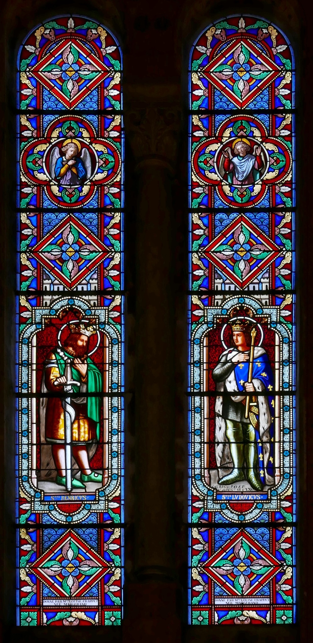 Fenster mit zwei in Rundbogen endenden Lanzetten, die in der unteren Hälfte zwei Könige als Ganzfiguren auf rotem Grund zeigen. Links ist der heilige Heinrich II. (973/978–1024) in goldenem Rock, mit grünem Mantel und einem grossen Schwert dargestellt. Rechts ist der heilige Ludwig IX. (1214–1270) in einer Rüstung und mit einem mit Hermelin verbrämten und mit goldenen Lilien besetzten blauen Mantel zu sehen. In der Hand hält er den Richtstab. Die beiden Namen der Könige finden sich unterhalb der Figuren, die von einem hellblauen Rahmen mit Blatt- und Blütenmuster gefasst sind. Die übrigen Fensterflächen sind mit farbigen geometrischen und architektonischen Motiven und Blattornamenten im Stil der Gotik gestaltet. Im oberen Drittel der Lanzetten je ein Vierpass mit Medaillon und der Halbfigur eines Engels; zuunterst Stifterinschrift.