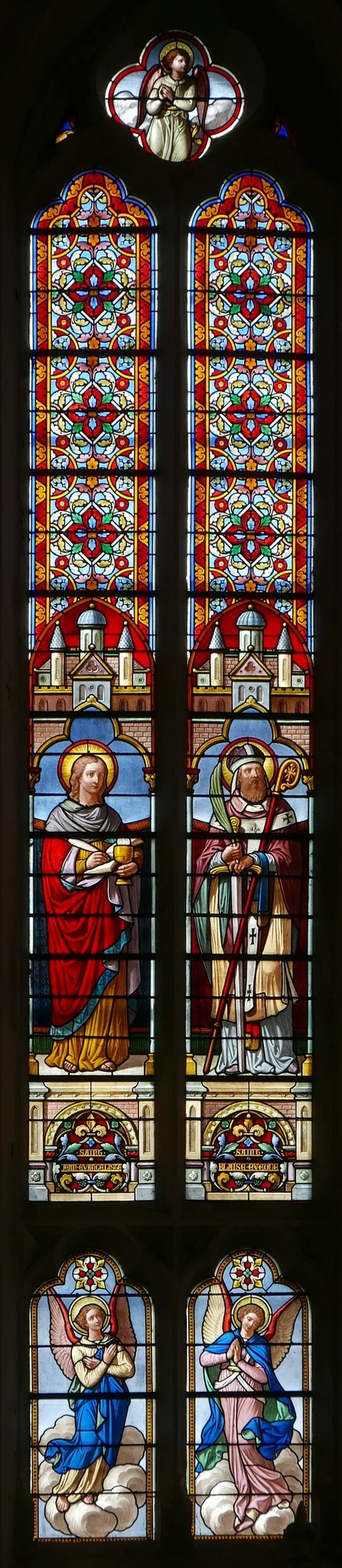 Zweilanzettiges Masswerkfenster, das zusätzlich horizontal in einen oberen und einen unteren Bereich gegliedert ist. Im Couronnement stehender Vierpass. Im Zentrum der Lanzetten sind links Johannes der Evangelist und rechts der heilige Blasius – Schutzpatron der Kirche von Sévrier – als Ganzfiguren dargestellt. Johannes ist in einen roten Mantel gehüllt und hält in seinen Händen ein Buch, einen Kelch mit Hostie sowie eine Schreibfeder. Blasius ist im reichen Bischofsornat mit Schwert und Märtyrerpalme gezeigt. Die Figuren stehen auf architektonischen Sockeln mit ihrem Namenszug und sind eingefasst von schmalen Säulen und einem Baldachin. Der obere Bereich der Lanzetten ist mit farbigen geometrischen Blattmustern im Stil der Gotik dekoriert. Im darüberliegenden Vierpass erscheint ein betender Engel. Im unteren Bereich der Lanzetten sind zwei weitere Engel auf Wolken zu sehen; sie bilden eine grössere Gruppe mit den in den übrigen Chorfenstern untergebrachten Engeln.