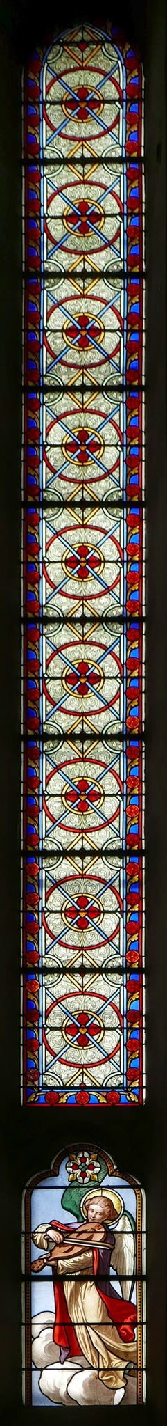 Das Chorfenster s III bauzeitlichen Glasmalerei-Ausstattung der Kirche Saint-Blaise in Sévrier, die um 1878–1881 vom renommierten Atelier Gsell-Laurent in Paris hergestellt wurde. In der Region war die Werkstatt bereits durch Glasmalereien für Kirchen in Albens (CG_226–CG_240), Chambéry (CG_241–CG_275) und Voiron (CG_286–CG_342) bekannt. Womöglich dienten diese den Auftraggebern als Anhaltspunkt für die Chorfenster: übereinstimmende Darstellungen des Evangelisten Johannes und des Apostels Andreas finden sich sowohl in Sévrier (CG_208, CG_209) wie auch in Chambéry (Cathédrale Saint-François de Sales, CG_274). Der ebenfalls im Chor gezeigte heilige Franz von Sales (CG_209) ist ebenso in Albens (Église Saint-Alban, CG_227) zu sehen: Franz von Sales, im frühen 17. Jahrhundert Bischof von Genf mit Sitz in Annecy, war in der Gegend stark verehrt und Schutzpatron der Städte Genf, Annecy und Chambéry. Um 1880 griff das Atelier Gsell-Laurent oft auf bereits vorhandene Entwürfe zurück, was auch das Hauptfenster in Sévrier (CG_207) belegt: Vergleichbare Darstellungen des Pfingstwunders sind in L’Isle-Adam (Église Saint-Martin, CG_93) und Mauron (Église Saint-Pierre) erhalten, zudem existieren Entwürfe des Ateliers für ein ähnliches Pfingstfenster in Nancy (Église Saint-Léon; siehe Musée Carnavalet, Paris, D.14638(259) und D.16190). Die Vision der Margareta Maria Alacoque, die das Couronnement des Hauptfensters ziert, findet sich übereinstimmend in Château-Chalon (Église Saint-Pierre). Trotz solcher Übereinstimmungen bilden die Chorfenster in Sévrier mit ihrer horizontalen Zweiteilung und den Engelsdarstellungen im unteren Bereich ein eigenständiges und überzeugendes Ensemble.
