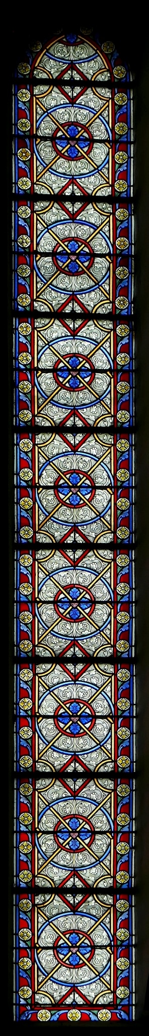 Langgezogenes Spitzbogenfenster, das mit sich wiederholenden farbigen geometrischen Motiven (Kreise, diagonale Linien und stehende Vierecke), Grisaillemalerei (Blüten- und Blattranken) und einem farbigen Rahmen mit Blatt- und Blütenmuster gestaltet ist.