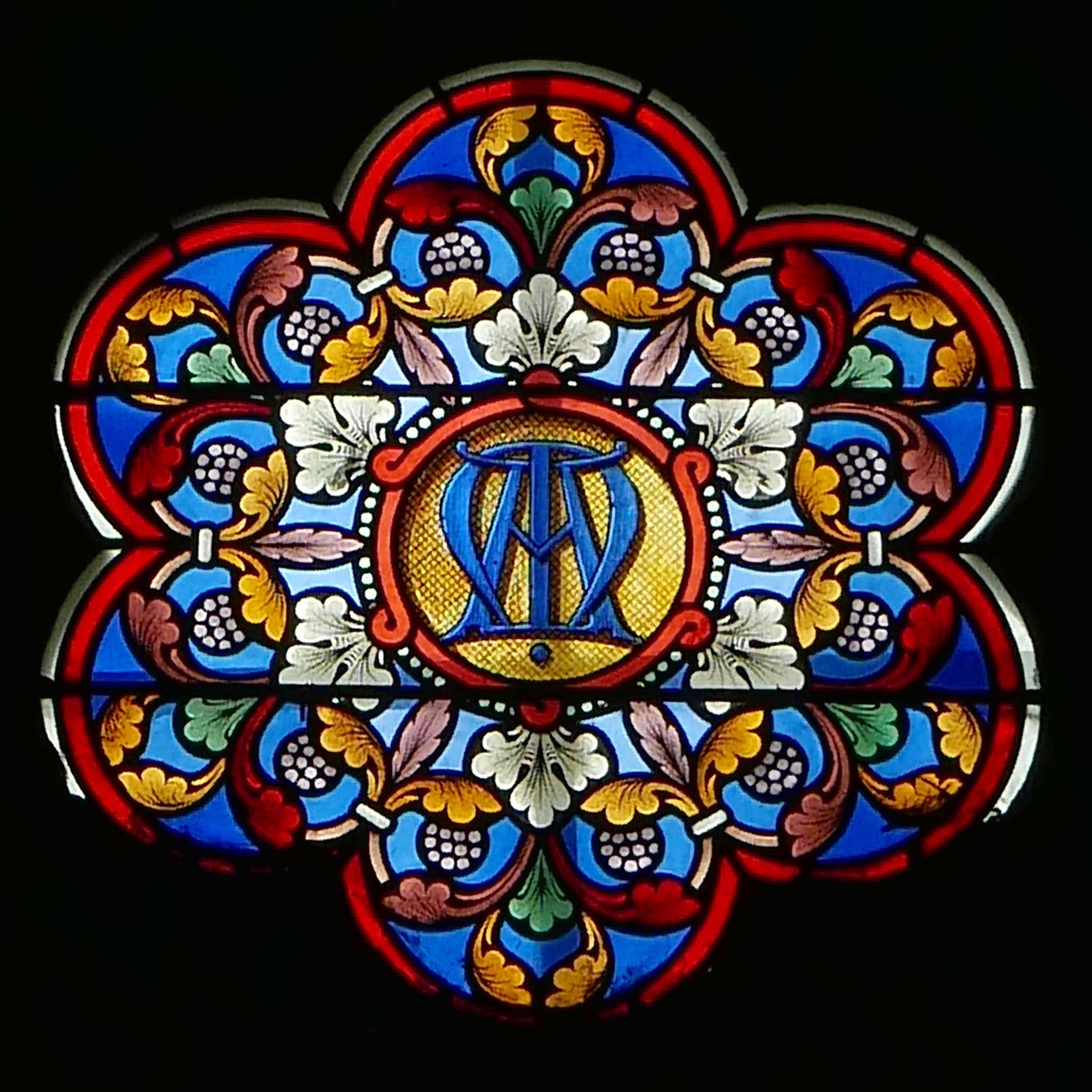 Sechspassfenster mit farbigem, kreisförmig angeordneten Blatt- und Blütendekor im Stil der Gotik. Grundfarben Blau, Rot, Gelb. Im Zentrum auf gelbem Grund ein blaues Marienmonogramm.