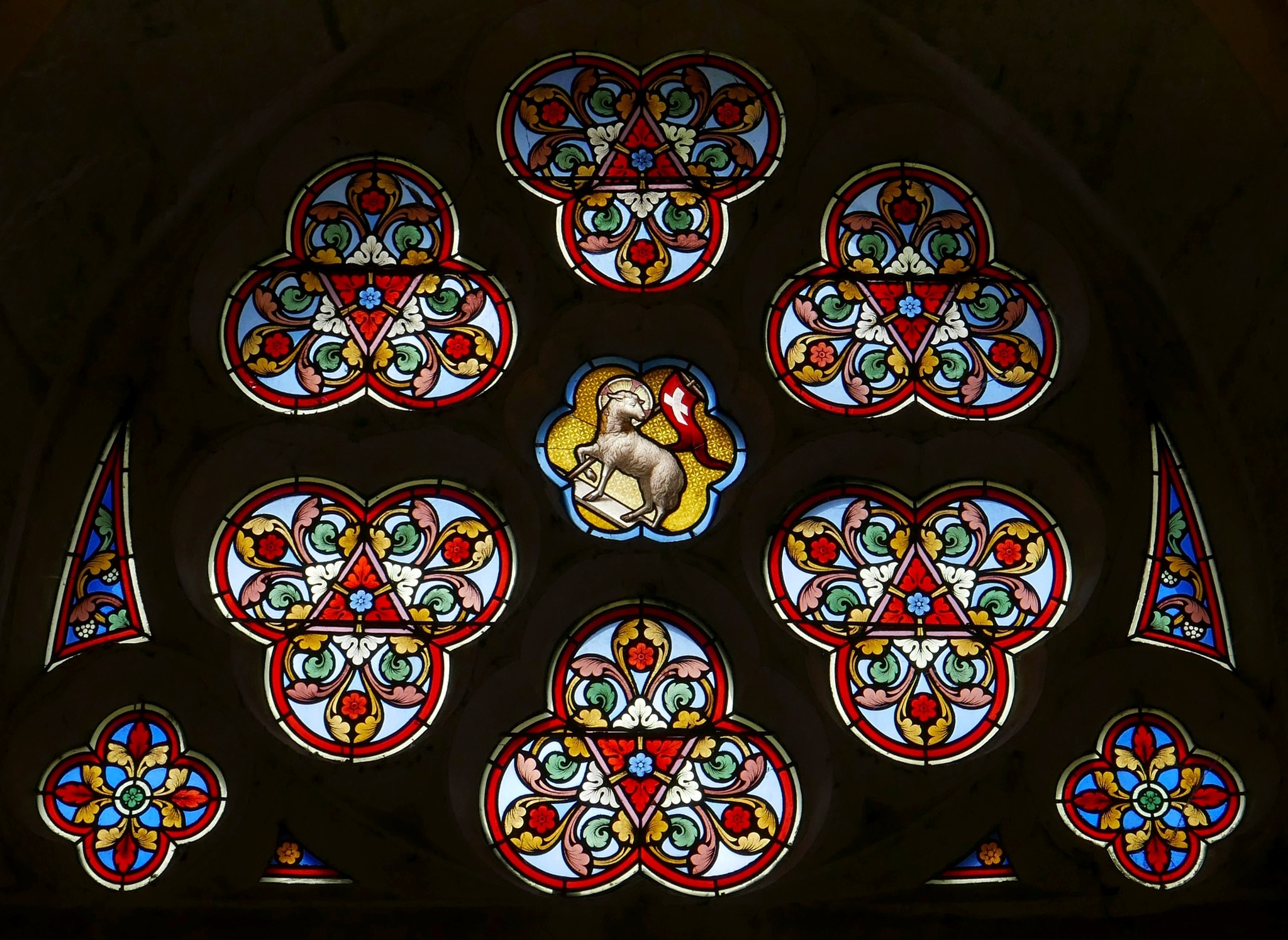 Masswerkfenster (Couronnement des Kirchenportals) mit sechs Dreipässen, die um einen kleinen Sechspass angeordnet sind; zudem unten rechts und links zwei Vierpässe und zwei Zwickel. Im zentralen Sechspass ist das Osterlamm mit Siegesfahne dargestellt. Die übrigen Masswerkfüllungen sind mit geometrischen farbigen Blatt- und Blütenmustern gestaltet.