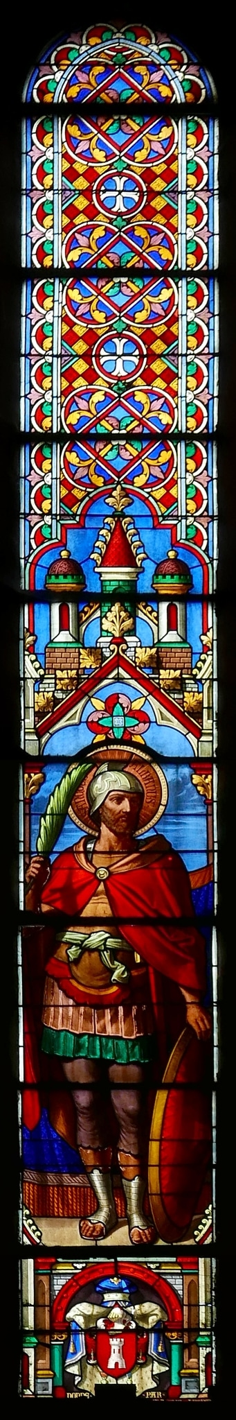 Langgezogenes Spitzbogenfenster, in dessen unterer Hälfte der heilige Alban von England – Patron der Kirche von Albens – als römischer Soldat mit Brustpanzer, Helm und Schild und mit einer Märtyrerpalme dargestellt ist. Der Heilige steht unter einem architektonischen Baldachin im Stil der Gotik und auf einem Sockel, der das Vollwappen Philibert Mollards mit Wappenmantel zeigt. Die übrige Fensterfläche ist mit farbigen geometrischen Motiven und Blattmustern gestaltet.