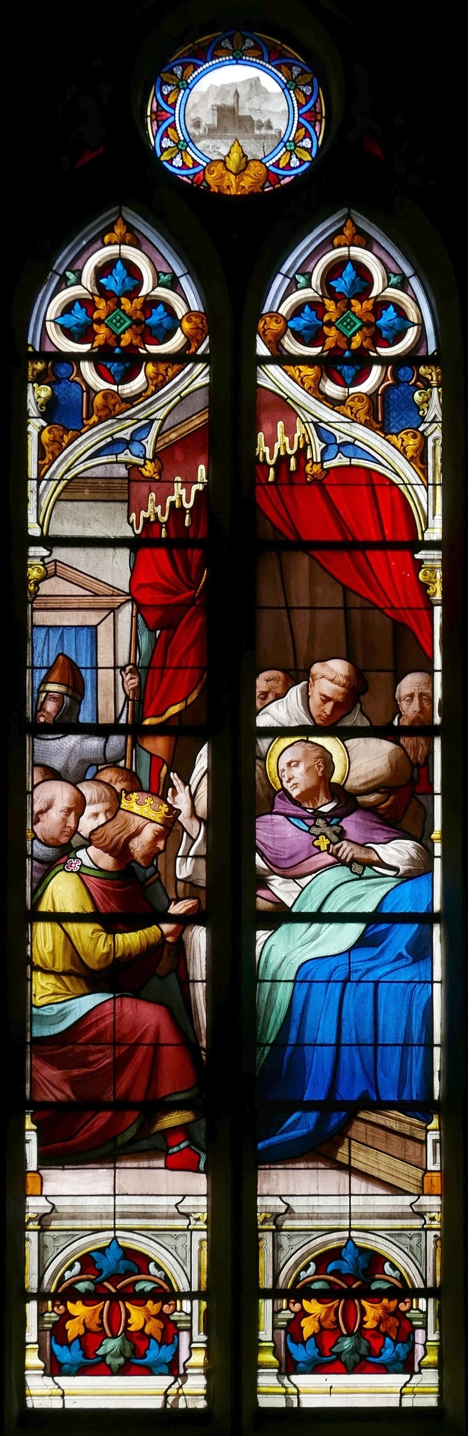 Zweilanzettiges Masswerkfenster mit einer Darstellung des heiligen Anthelm, Bischof von Belley, der kurz vor seinem Tod den Grafen Humbert III. von Savoyen empfängt. Umgeben von Gefolgsleuten kniet Humbert betend vor Anthelms Sterbebett und bereut die Taten, die er an Priestern des Bistums verübt hat. Anthelm, der ihm die lang ersehnte Geburt eines Sohnes und Nachfolgers vorausgesagt hat, segnet den Grafen. Er hat eine Hand im Segensgestus erhoben, in der anderen hält er ein Kruzifix. Mehrere Mönche kümmern sich um den ermatteten Heiligen. Die Bildszene ist über einem architektonischen Sockel platziert und von schmalen Säulen flankiert, über denen sich ein Baldachin im Stil der Neugotik erhebt. In der kreisrunden Öffnung des Couronnement ist in einem Sechspass mit Blattornamenten der Geburtsort des heiligen Anthelm, das Schloss La Biguerne in Chignin vor dem Berg Granier dargestellt.