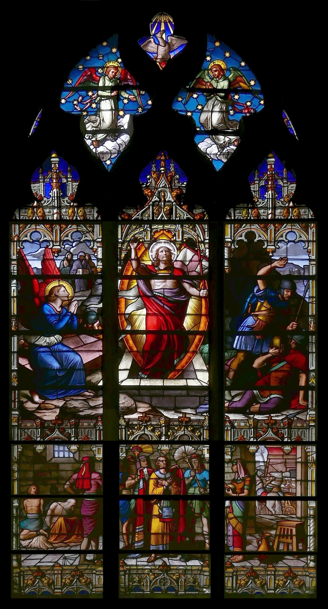 Der Glasmaler Caspar Gsell hatte seit 1861 bereits verschiedene Aufträge für die Kirche Notre-Dame ausgeführt. Als erstes lieferte er das Livanius-Fenster, ein Medaillonfenster mit Szenen aus dem Leben des Heiligen (CG_277). Gleichzeitig war das Pariser Atelier von Claudius Lavergne mit einem Medaillonfenster zum heiligen Ludwig IX. beauftragt worden (siehe dazu Gérin, 1865). Als 1869 der Architekt Edmond Duthoit (1837–1889) die Restaurierung der Kirche plante, schlug der Pfarrer Laurent vor, die Gelegenheit zu nutzen, um die Fenster im Chorobergaden mit farbigen Glasmalereien zu versehen. Der Auftrag sollte an einen der beiden in Senlis bereits bekannten Glasmaler vergeben werden. Gemeindemitglieder, Kirchenkommission und Pfarrer sprachen sich für Lavergne aus; die Wahl fiel schliesslich auf den vom Architekten bevorzugten Caspar Gsell. Zu Ostern 1870 wurden die hauptsächlich durch Spenden finanzierten sieben Glasmalereien für insgesamt 18’500 Francs im Obergaden des Chors zur Zufriedenheit aller Beteiligten eingesetzt (Laurent, 1889, 28 und Registres des délibérations du Conseil de Fabrique, Einträge von April 1869 bis Juni 1870). Sie zeigten im oberen Bereich der Lanzetten die Geburt Marias, die Präsentation Marias im Tempel, die Verkündigung, die Heimsuchung, die Geburt Jesu Christi, die Hochzeit in Kana und die Krönung Marias, sowie im unteren Bereich der Lanzetten die Schutzpatrone der Stadt und der sieben mit der Revolution aufgelösten und später der Kirchgemeinde Notre-Dame angegliederten Kirchgemeinden von Senlis (siehe Laurent, 1889, 28–34 und Aubert, 1910, 165–167). Die sieben Fenster wurden während der beiden Weltkriege im 20. Jahrhundert zerstört, überliefert ist einzig eine Entwurfszeichnung von 1869 im Pariser Musée Carnavalet (D.16082) für das zentrale Chorfenster.