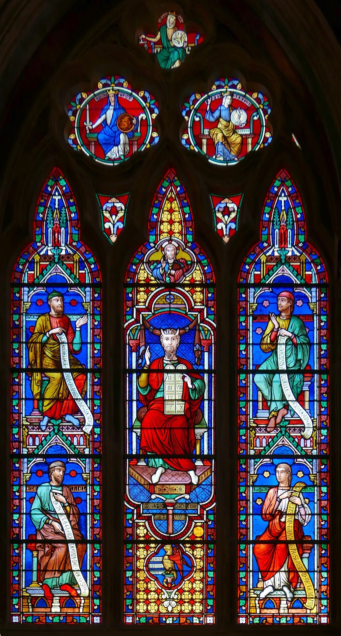 Masswerkfenster mit drei in Nonnenköpfen endenden Lanzetten; darüber zwei Sechspässe und ein Vierpass als Couronnement. In der mittleren Lanzette ist in einem langgezogenen Medaillon Moses, der Führer des israelitischen Volkes, auf einem Thron sitzend gezeigt. Er verkörpert die Gesetze des Alten Testaments: mit einer Hand zeigt er auf die Tafeln mit den Gesetzen, die Gott ihm zur Vorbereitung auf das Kommen Jesu Christi offenbart hat, mit der anderen Hand zeigt er nach oben zum Himmel. Über Moses findet sich in einem Vierpass ein Brustbild des Gottessohnes mit dem Evangelium in der Hand. Unterhalb der Darstellung von Moses ist ebenfalls in einem Vierpass die durch Moses geschaffene eherne Schlange (hier mit Löwenkopf und Flügeln) dargestellt (Num 21, 6–9). Die beiden seitlichen Lanzetten zeigen unter Baldachinen im Stil der Gotik je zwei sitzende «grosse» Propheten auf blauem Grund; links Jesaia und Ezechiel, rechts Jeremia und Daniel. Die Propheten halten Schriftrollen mit Textpassagen ihrer Bücher in den Händen. In den Sechspässen und dem Vierpass des Couronnement sind drei der vier Kardinaltugenden als sitzende Frauen (Allegorien) gezeigt; die Tapferkeit (Fortitudo) mit Schwert und Schild mit Löwenkopf, die Klugheit (Prudentia) mit Schlange und Spiegel, sowie die Gerechtigkeit (Justitia) mit Waage und einem Schild mit einer Taube in Flammen.