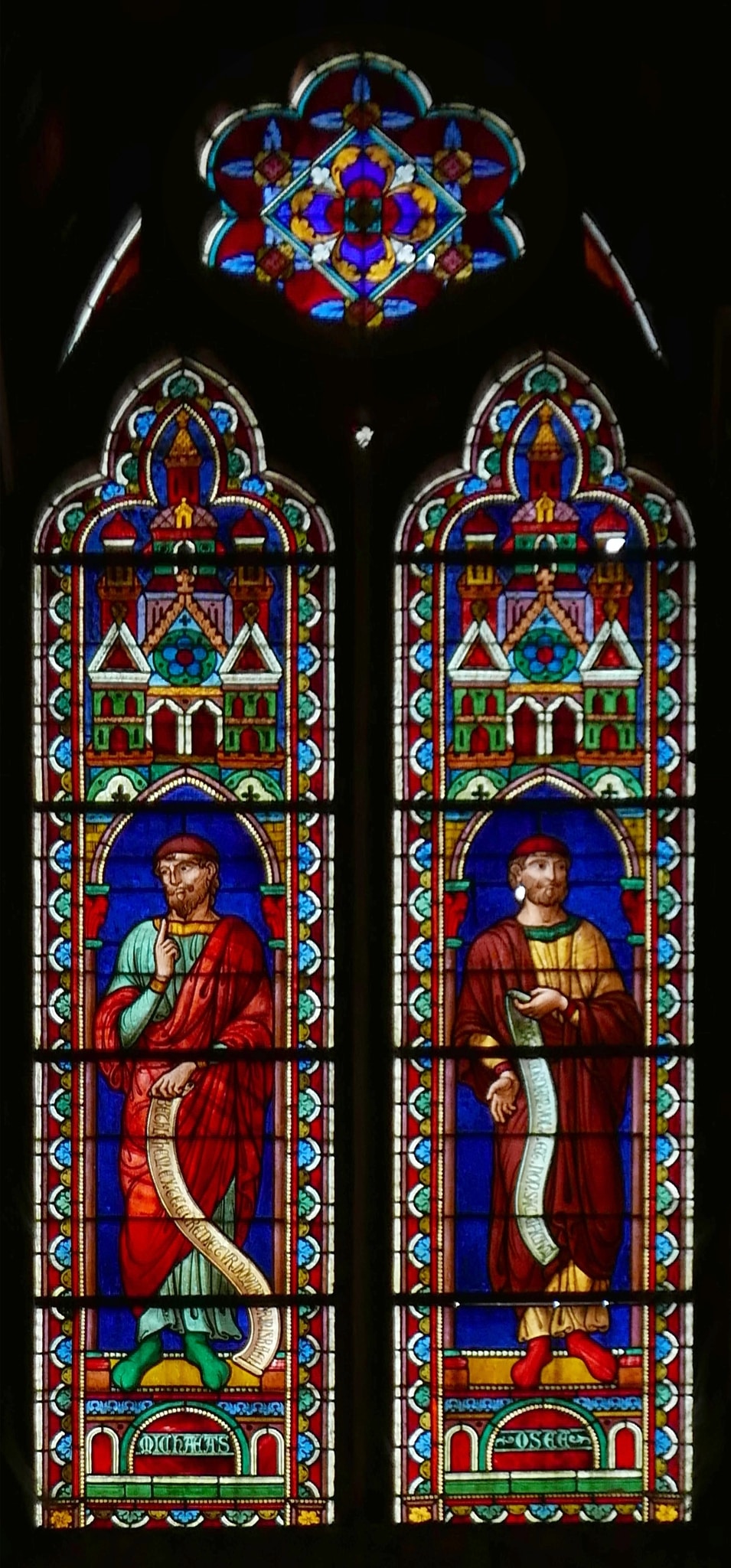 Masswerkfenster mit zwei in Nonnenköpfen endenden Lanzetten; darüber Sechspass als Couronnement. Das Obergadenfenster zeigt zwei der «kleinen» Propheten als Ganzfiguren auf blauem Grund: Micha in der linken Lanzette, Hosea in der rechten Lanzette. Beide Propheten halten Schriftbänder mit einem Ausschnitt ihrer Prophezeiungen in den Händen. Die Figuren stehen auf einem architektonischen Sockel mit jeweiligem Namenszug und sind von schmalen Säulen flankiert, über denen sich Baldachine im Stil der Gotik erheben. Die Lanzetten haben farbige ornamentale Rahmen. Im Couronnement konzentrisch angeordnete Blüten- und Blattornamente sowie ein eingeschriebenes stehendes Quadrat (Grundfarbe Rot); zudem mehrere Masswerkspickel mit farbigen Füllungen.