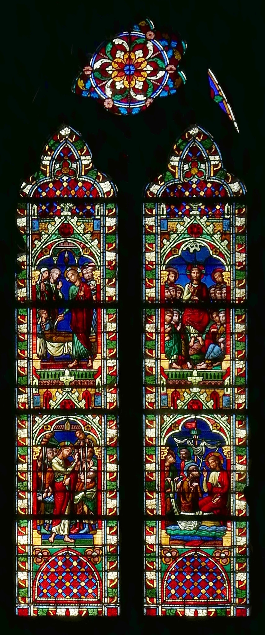 Masswerkfenster mit zwei in Nonnenköpfen endenden Lanzetten; darüber Sechspass als Couronnement. Beide Lanzetten enthalten über einem architektonischen Sockel zwei Bildszenen auf blauem Grund, die von krabbenbesetzten Baldachinen im Stil der Gotik überfasst und von unten nach oben und von rechts nach links gelesen werden. Rechts unten ist der wunderbare Fischzug des Simon Petrus gezeigt (Lk 5, 4–11): Die Jünger ziehen ein Netz voller Fische an Bord eines Schiffes, während der reuige Petrus vor dem predigenden Jesus Christus kniet. Rechts oben ist die Berufung und Aussendung der zwölf Apostel dargestellt (Mt 10, 1–15): Jesus sitzt von seinen Jüngern umgeben und lehrt sie ihren Auftrag. Die Bildszene unten links zeigt die Heilung eines Gelähmten in Kapernaum (Mk 2, 1–12): mehrere Männer lassen das Bett mit dem Gelähmten an Seilen zu Jesus Christus hinunter, der den Kranken segnet. Oben links ist zu sehen, wie Jesus Christus ein junges Mädchen vom Tod auferweckt (Mk 5, 35–43): Umgeben von mehreren Menschen fasst Jesus das auf dem Bett liegende Kind bei der Hand und weist es an aufzustehen.