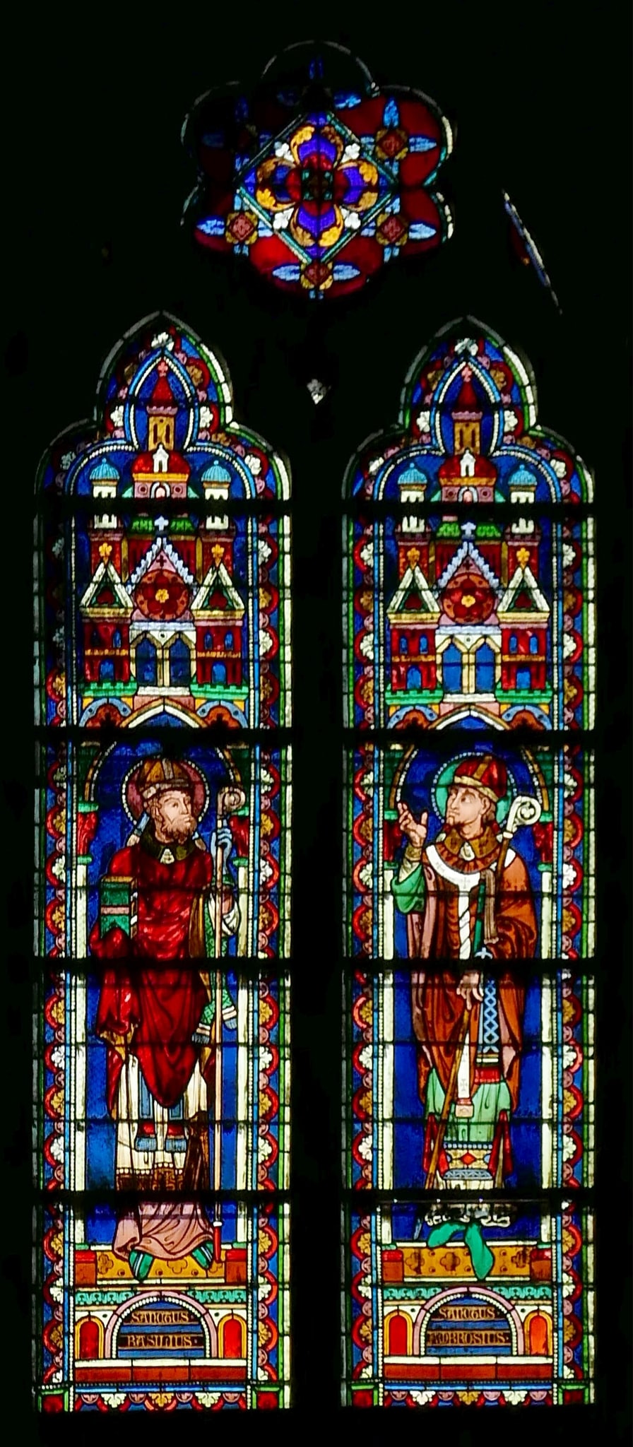 Masswerkfenster mit zwei in Nonnenköpfen endenden Lanzetten; darüber Sechspass als Couronnement. Das Obergadenfenster zeigt die bereits im Medaillonfenster s X (CG_308) des Seitenschiffs thematisierten Personen als Ganzfiguren auf blauem Grund: Basilius der Grosse in der linken Lanzette, Ambrosius von Mailand in der rechten Lanzette. Beide Heilige sind in reichem Bischofsornat mit Mitra und Krummstab dargestellt. Die Figuren stehen auf einem architektonischen Sockel mit jeweiligem Namenszug und sind von schmalen Säulen flankiert, über denen sich Baldachine im Stil der Gotik erheben. Die Lanzetten haben farbige ornamentale Rahmen. Im Couronnement konzentrisch angeordnete Blüten- und Blattornamente sowie ein eingeschriebenes stehendes Quadrat (Grundfarbe Rot); zudem mehrere Masswerkspickel mit farbigen Füllungen.