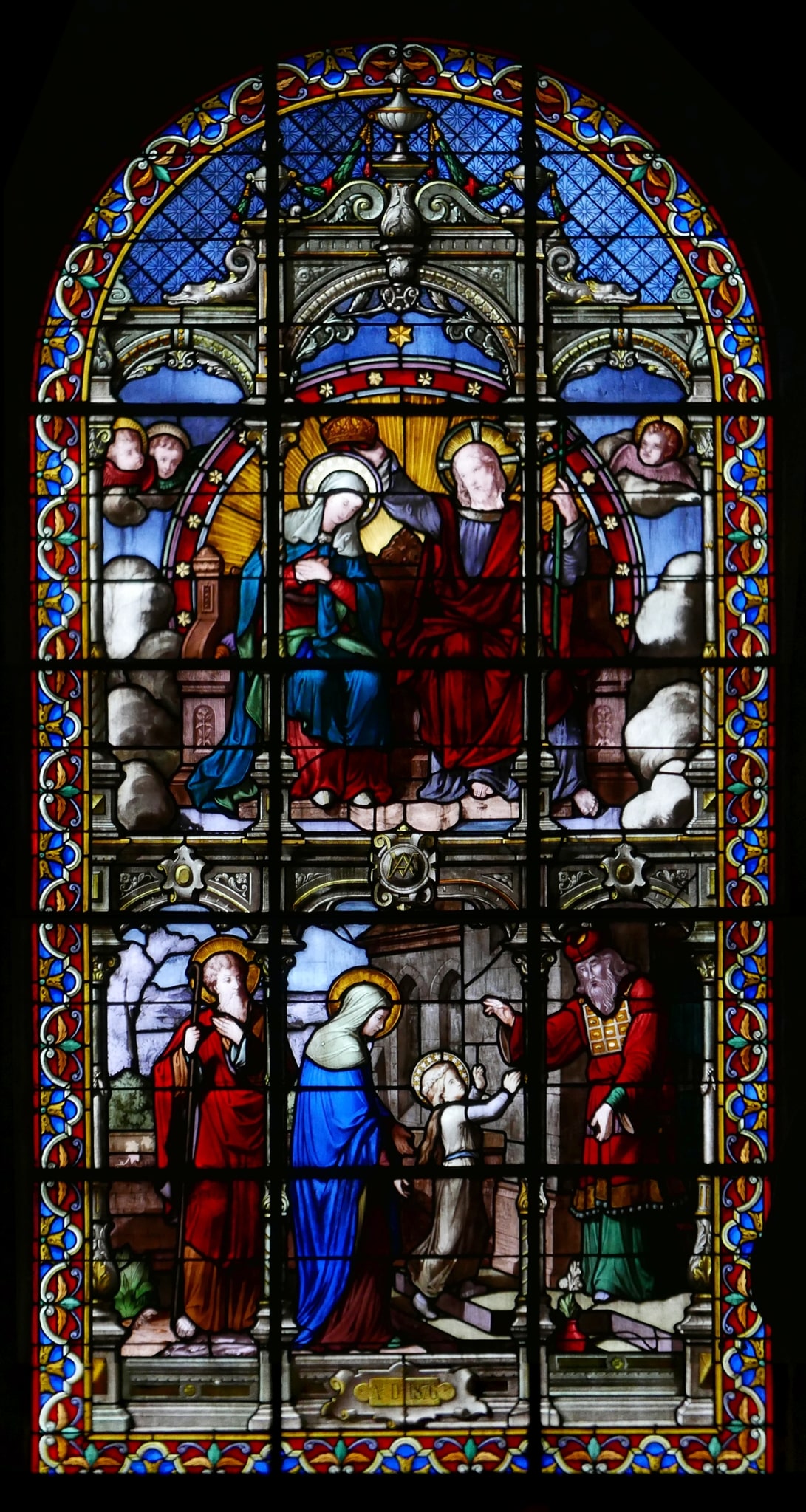 Grosses Rundbogenfenster mit zwei übereinanderliegenden Bildszenen in einer luftigen dreiteiligen Bogenarchitektur im Stil der Renaissance. Unten ist der Tempelgang Marias dargestellt: Maria geht mit erhobenen Händen die Treppe zum Tempel von Jerusalem hoch, an dessen Eingang ein Priester steht, der sie segnet. Hinter dem Mädchen stehen die Eltern Anna und Joachim. Die obere Fensterhälfte nimmt eine Darstellung der Marienkrönung ein: unter einem roten, mit Sternen besetzten Bogen sitzen auf zwei Thronen Maria und Jesus Christus. Jesus hält in einer Hand das Kreuzbanner, mit der anderen setzt er seiner Mutter die Krone auf. Wolken und geflügelte Engelsköpfe begleiten die Darstellung. Am Fensterfuss im architektonischen Sockel Kartusche mit Jahreszahl; zwischen den beiden Bildszenen Medaillon mit Marienmonogramm. Ein farbiger Ornamentrahmen fasst das gesamte Fenster ein.