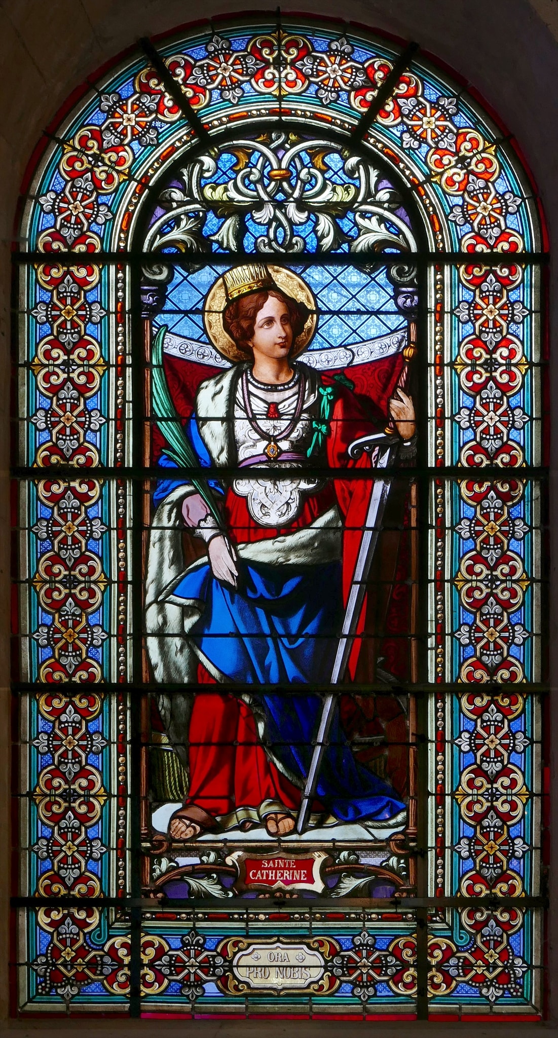 Rundbogenfenster mit einer Darstellung der heiligen Katharina von Alexandrien als Ganzfigur vor einem roten Wandteppich. Die Heilige ist als Königstochter mit einer Krone, einem Brustharnisch und einem mit Hermelin gefütterten Mantel gezeigt. In den Händen hält sie die Märtyrerpalme und ein Schwert, das Werkzeug ihres Martyriums. Hinter Katharina ist das (zerbrochene) Rad zu sehen, auf dem sie gefoltert wurde. Das Figurenbild ist gefasst von einer feingliedrigen Bogenarchitektur; das Bogenfeld mit verschlungenen Ranken besetzt. Unterhalb der Figur eine Schriftkartusche mit dem Namen der Heiligen. Eine zweite Schriftkartusche mit der Aufforderung «Bete für uns» befindet sich im breiten Rahmen mit Ornamenten im Stil der Renaissance, der das Figurenbild umfasst.