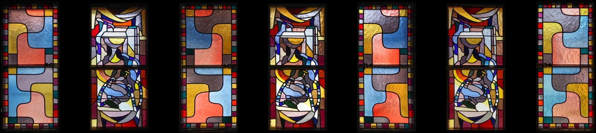 GSL_27: Ensemble de sept vitraux alternant motifs géométriques et objets liturgiques