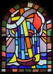Pour les sept verrières du baptistère, Jordan choisit trois sujets différents : une étoile (celle de Bethléem), la colombe du saint Esprit et une barque portant la croix. Ces trois symboles évoquent la grâce baptismale : l’étoile comme guide, la barque comme signe de victoire sur toute tempête et la colombe de l’Esprit saint qui nous rappelle que nous avons été baptisés dans le Christ (Python, 2017, p. 153). L’artiste a placé la colombe face à la porte d’entrée du baptistère et a alterné ensuite l’étoile et le bateau, qui sont représentés chacun à trois reprises.