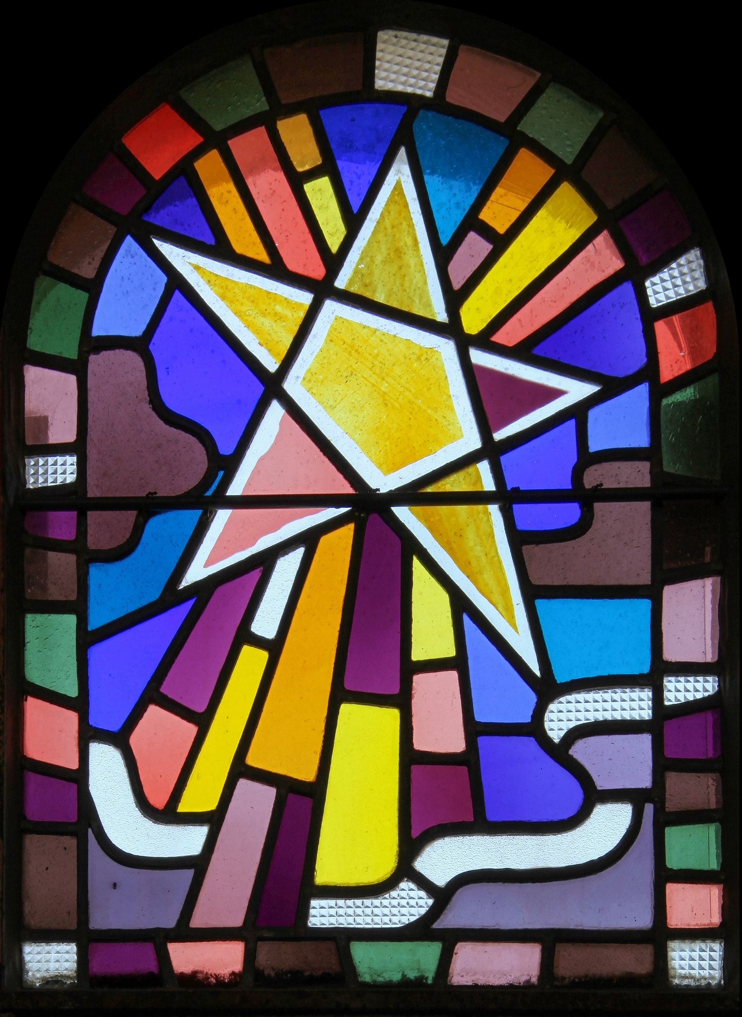 Pour les sept verrières du baptistère, Jordan choisit trois sujets différents : une étoile (celle de Bethléem), la colombe du saint Esprit et une barque portant la croix. Ces trois symboles évoquent la grâce baptismale : l’étoile comme guide, la barque comme signe de victoire sur toute tempête et la colombe de l’Esprit saint qui nous rappelle que nous avons été baptisés dans le Christ (Python, 2017, p. 153). L’artiste a placé la colombe face à la porte d’entrée du baptistère et a alterné ensuite l’étoile et le bateau, qui sont représentés chacun à trois reprises.