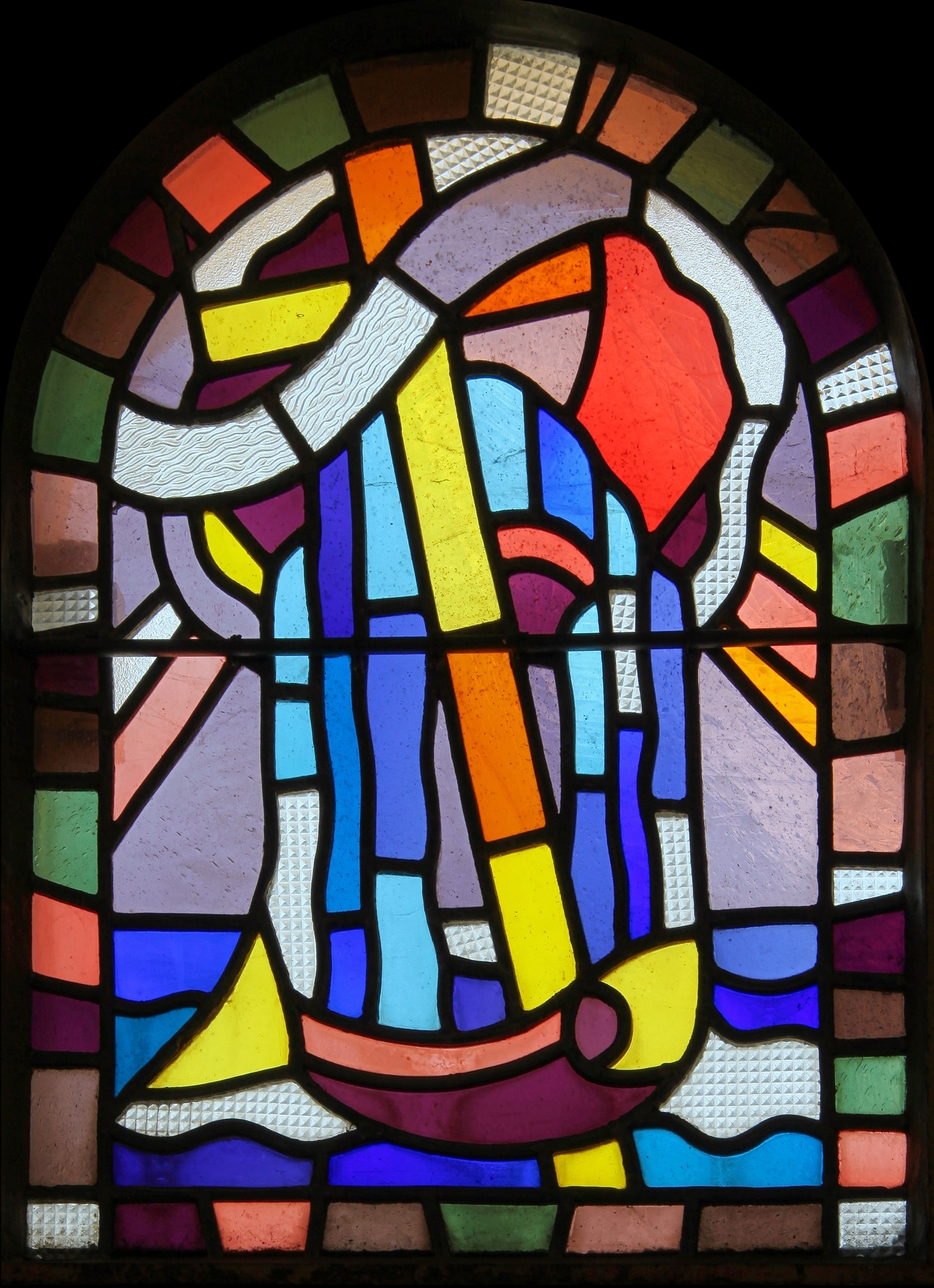 Pour les sept verrières du baptistère, Jordan choisit trois sujets différents : une étoile (celle de Bethléem), la colombe du saint Esprit et une barque portant la croix. Ces trois symboles évoquent la grâce baptismale : l’étoile comme guide, la barque comme signe de victoire sur toute tempête et la colombe de l’Esprit saint qui nous rappelle que nous avons été baptisés dans le Christ (Python, 2017, p. 153). L’artiste a placé la colombe face à la porte d’entrée du baptistère et a alterné ensuite l’étoile et le bateau, qui sont représentés chacun à trois reprises.