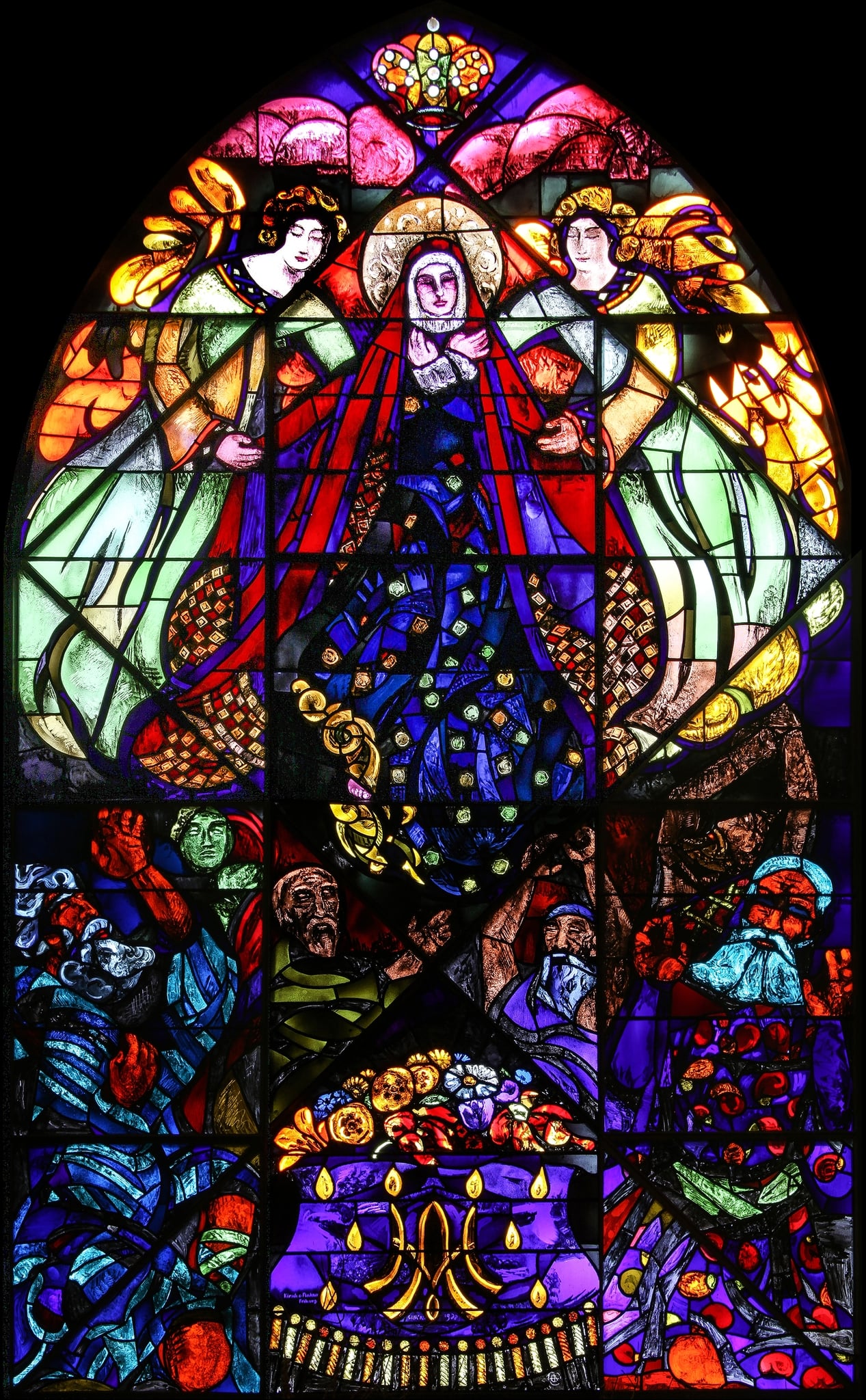 Dans la partie supérieure, la Vierge nimbée et de face, les mains croisées sur sa poitrine, porte un grand manteau rouge dont le revers, partiellement apparent, est décoré d’un damier or et rouge sur une robe bleue illuminée de cercles colorés. Elle est entourée de deux anges aux grandes ailes flamboyantes, vêtus de robes vertes. Ils retiennent chacun d’une main un pan ouvert du manteau de la Vierge et de l’autre la soutiennent dans le dos. Une couronne dans des teintes orangées et vertes est figurée au sommet du vitrail. Des nuées roses se déploient juste au-dessous.