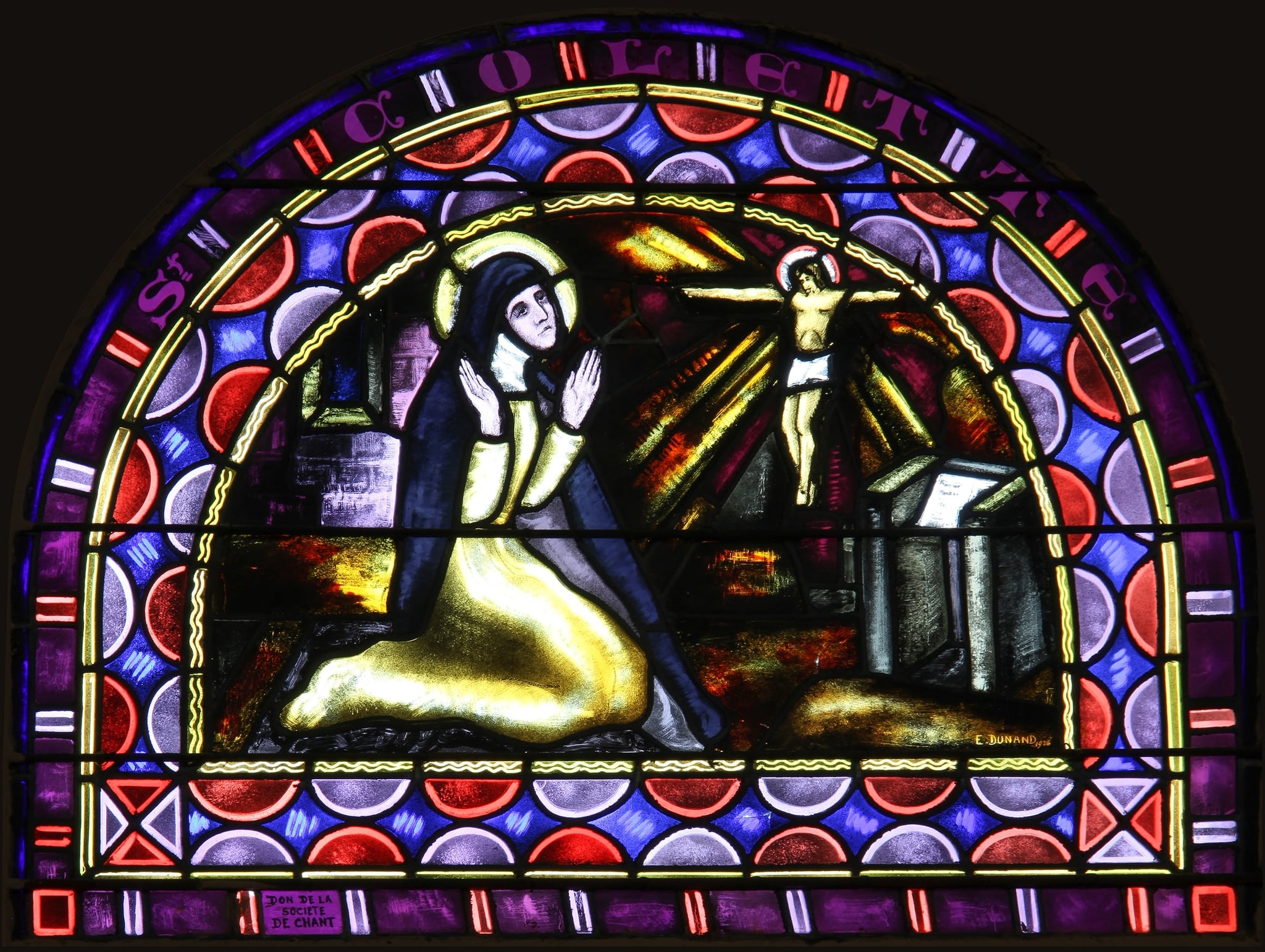 Pour ce vitrail consacré à Colette comme pour le repentir de saint Pierre, figurés tous deux dans un demi-cercle, Dunand pousse l’expérience de la couleur encore plus loin. C’est elle qui magnifie la composition et lui donne une grande force et ce jusque dans les plus petits détails. Ceci se confirme dans une lettre que le verrier adresse au curé, dans laquelle il écrit au sujet de ce vitrail qu’il “tien[t] absolument à ce que le filet bleu de son encadrement extérieur reste visible, car c’est d’une grande importance pour l’harmonie de ses couleurs (Dunand, 1926).