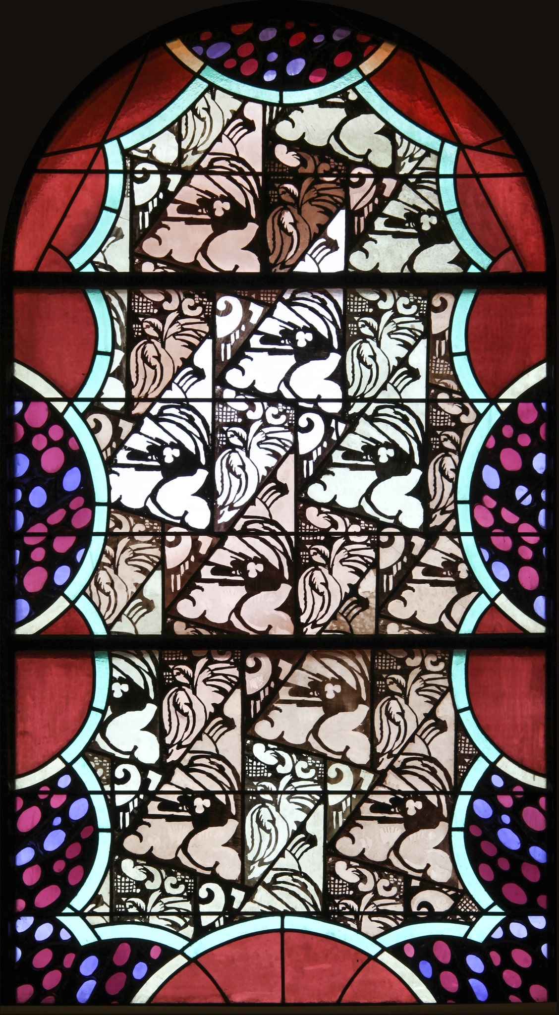 Ce vitrail ornemental est composé en son centre de motifs végétaux disposés géométriquement sur un fond quadrillé. Le tout est encadré d’une fine bordure bleue composée d’une multitude de courbes convexes. Une large bordure rose encadre le tout et est animée en différents endroits d’un fond décoratif noir orné de pastilles roses et bleues.